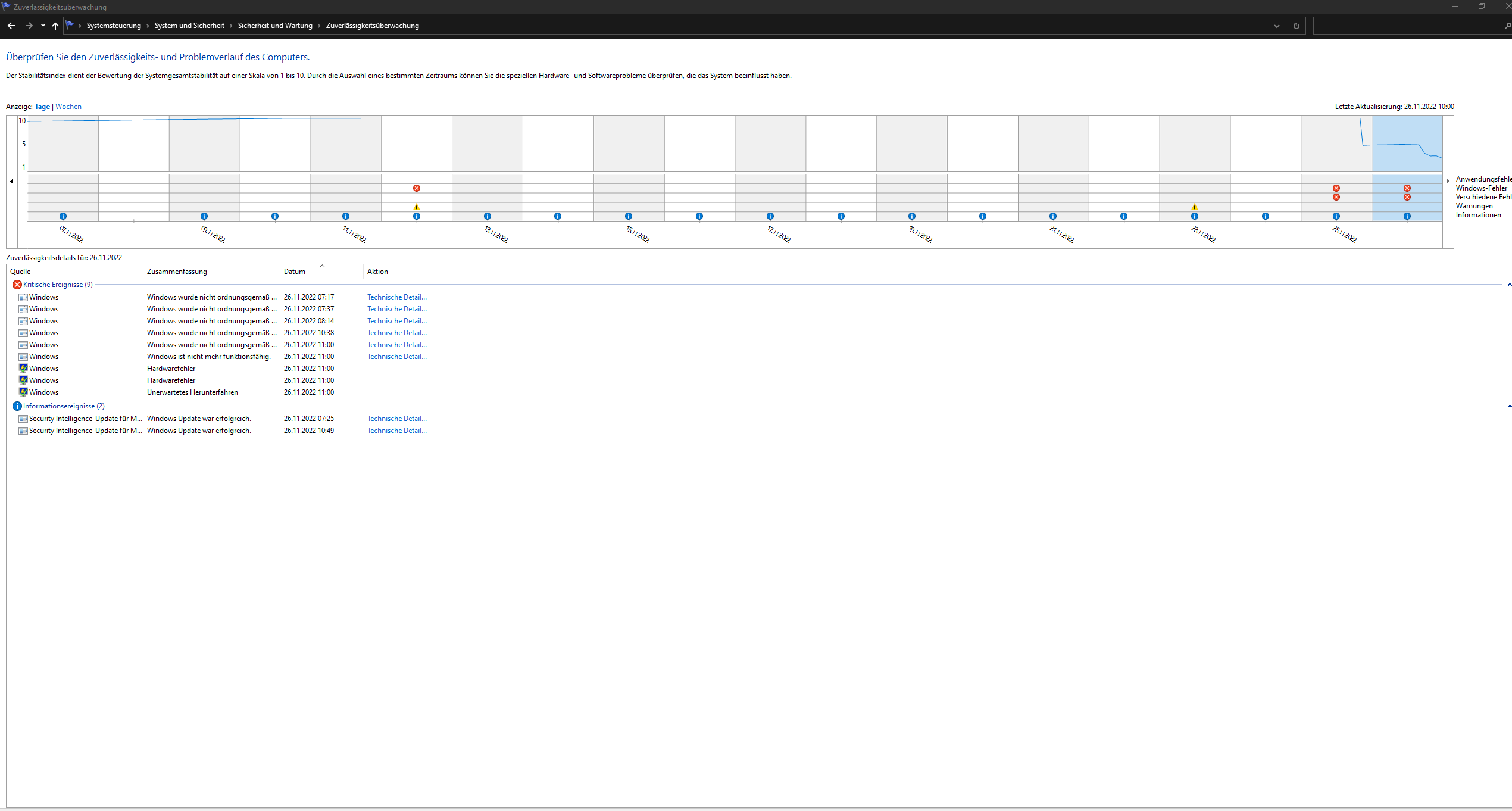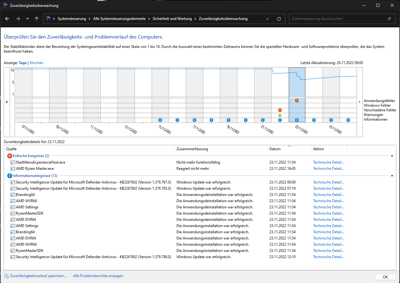 Zuerst kannst du mal im Zuverlässigkeitsverlauf schauen was dort für Fehler angezeigt werden.