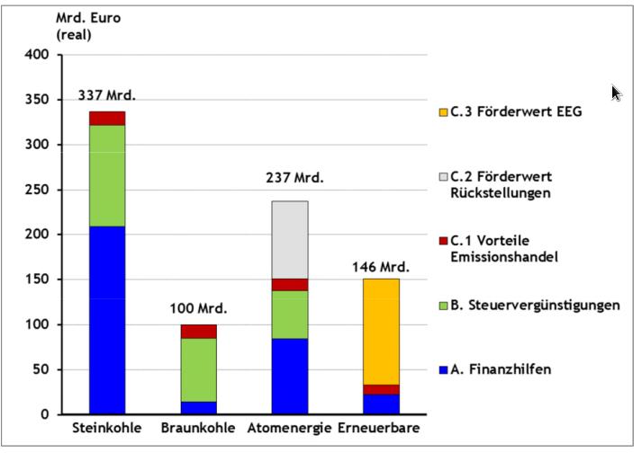 Diese Subventionen beziehen sich auf Fossile Energieträger als ganzes, das schließt den Verkehrssektor mit ein. Hier muss also bei der Summe schon bedacht werden, dass nicht nur die Stromproduktion gemeint ist, sondern generell alle Fossilen Energieträger.Die quantifizierbaren Subventionen in Deutschland für fossile Energieträger belaufen sich auf insge-