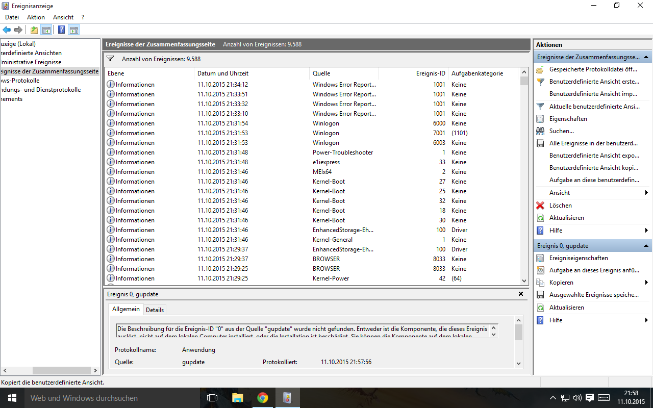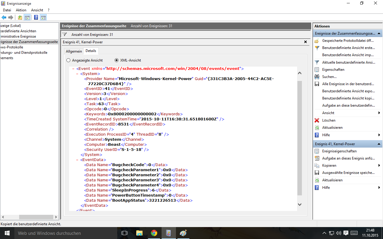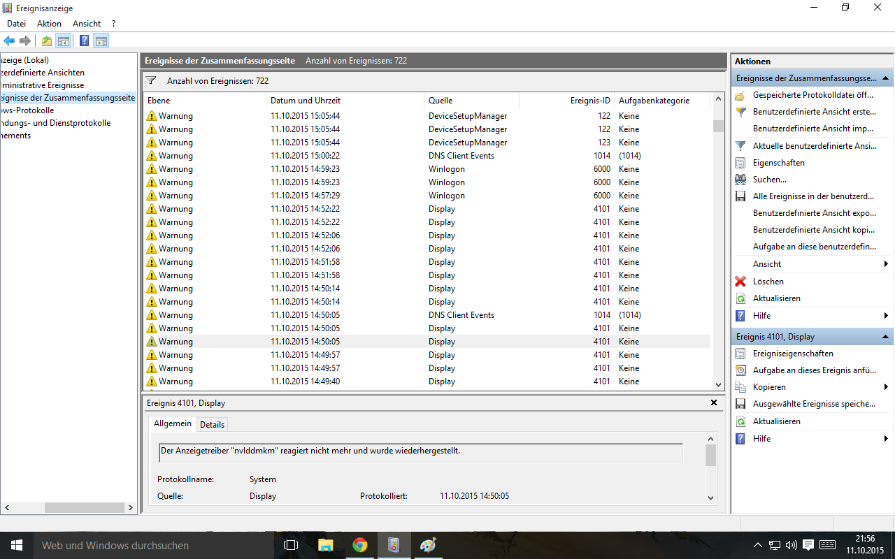 Kritische: Kernel Power Ereignis-ID 41. Heute 13 mal, als ich die Treiber installiert hab schätze ich mal. Sonst in den letzten 24 Stunden über 4.000 Fehler xD , 238 Warnungen und 2700 Informationen, 2000 mal überwachung erfolgreich, 40 mal überwachung gescheitert.