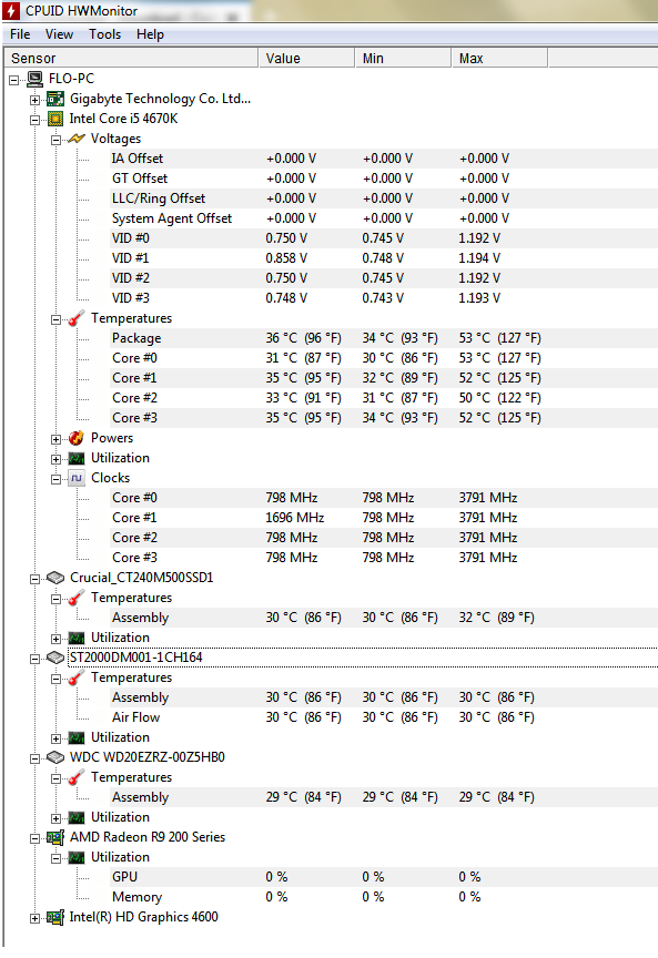 Hier ein Screenshot vom HWMonitor, allerdings sieht man die Temperatur der GraKa leider nicht. Außerdem lief der PC hier ruhig, bei Spielen sieht die Sache freilich anders aus. Aber während einem Absturz kann ich halt schlecht einen Screenshot machen und nach einem Absturz auch nicht, weil die Temperatur wieder unten ist, bis ich den PC neugestartet und HWMonitor ausgeführt hab.
