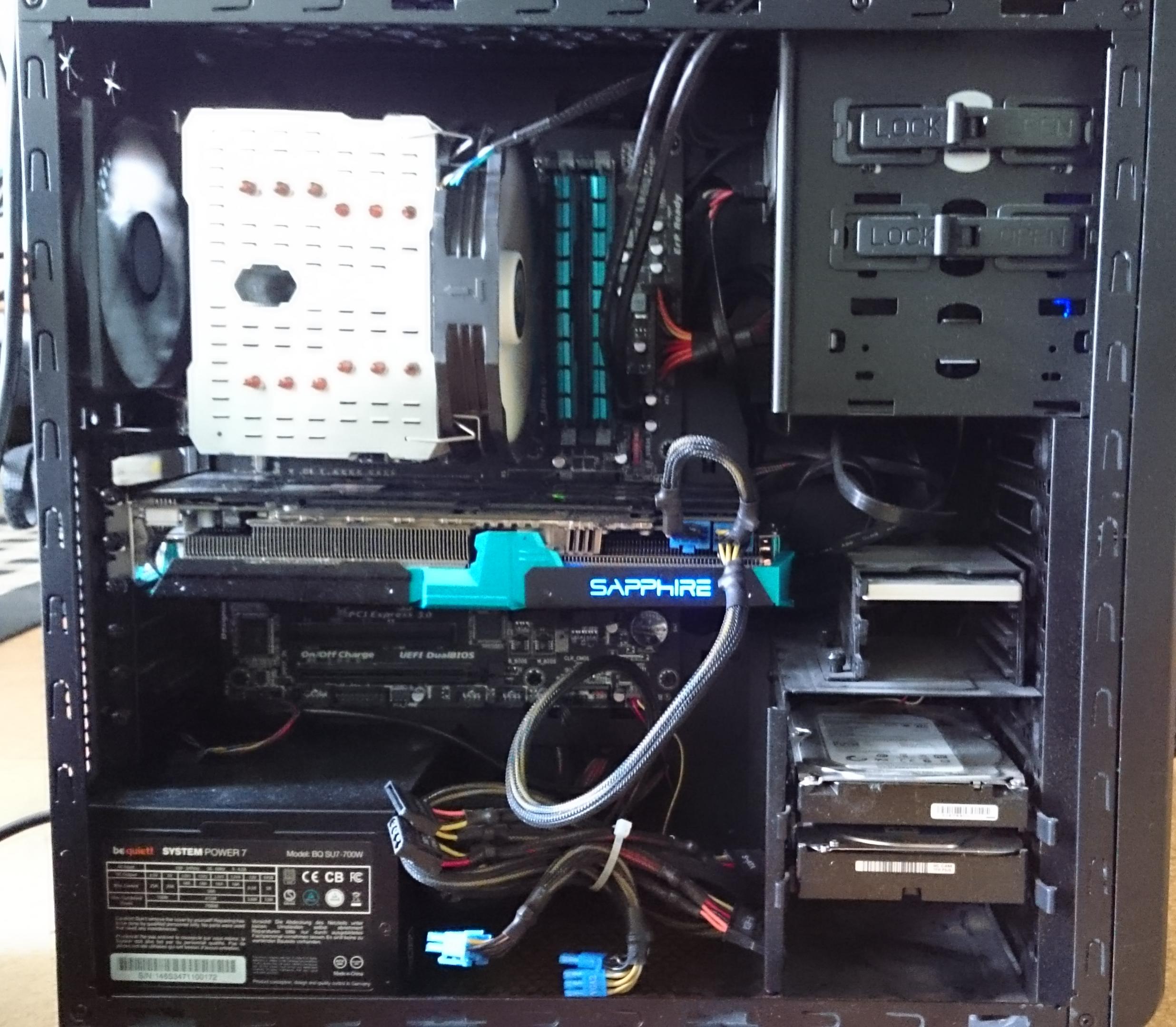 Weil meine W-LAN Karte ein ziemlich großer Brocken ist und die GraKa und der CPU-Lüfter auch extrem groß sind, ist das da drinnen alles ziemlich eng. Die Hitze von der GraKa staut sich genau um die W-LAN Karte, das Ding wird ziemlich heiß. Meine Überlegung war, dass vielleicht Steam-Spiele deshalb abschmieren, weil die W-LAN Karte abschmiert. Das würde auch erklären, warum Youtube-Videos oder Streams im Internet manchmal den Absturz auslösen. Und vielleicht ist es deshalb nicht passiert, als ich die GraKa ausgebaut und die On-Chip verwendet habe, weil dann mehr Luft da war und keine Hitze von der GraKa.