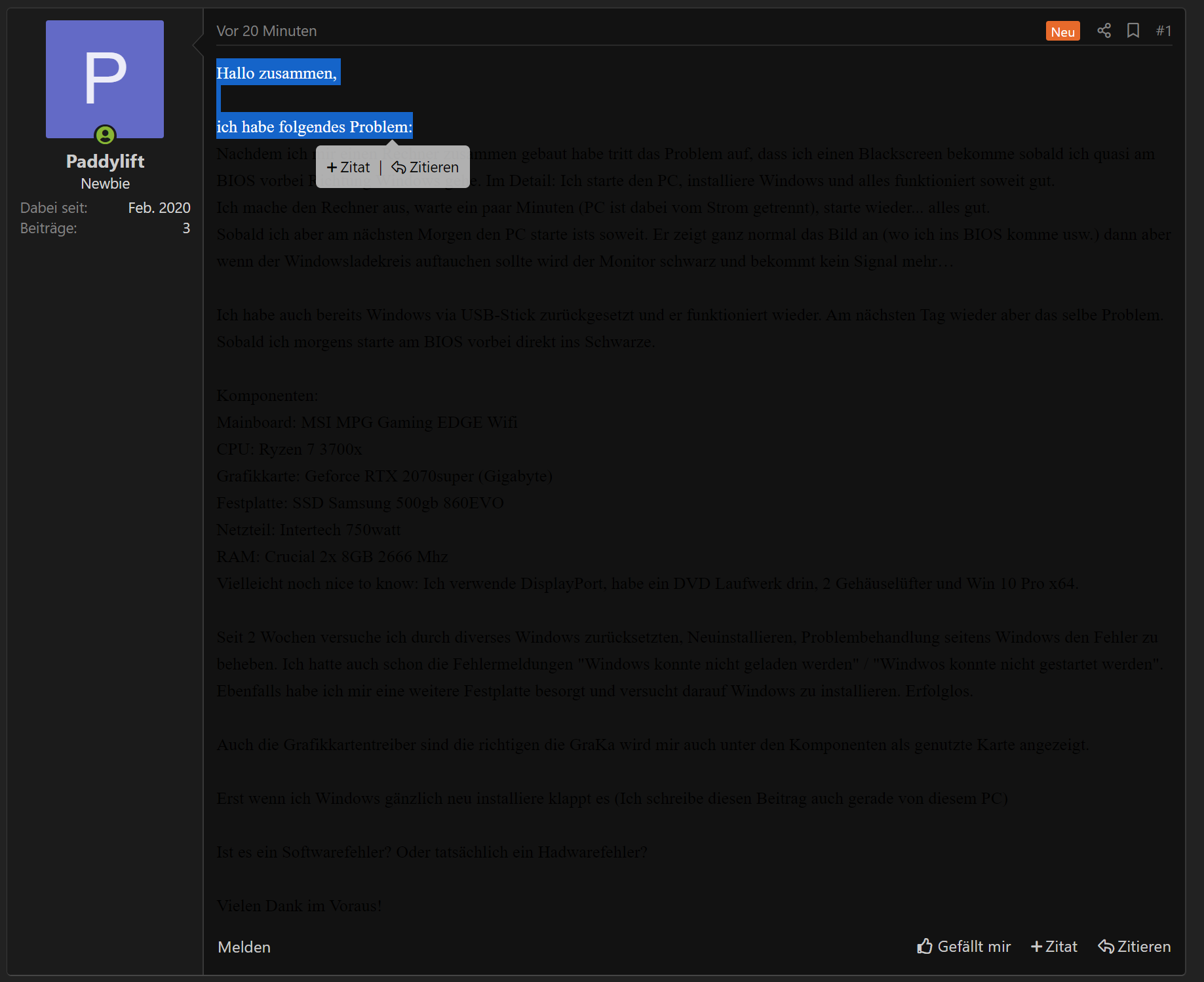 Nachdem ich mir einen Rechner zusammen gebaut habe tritt das Problem auf, dass ich einen Blackscreen bekomme sobald ich quasi am BIOS vorbei Richtung Windows gehe. Im Detail: Ich starte den PC, installiere Windows und alles funktioniert soweit gut.