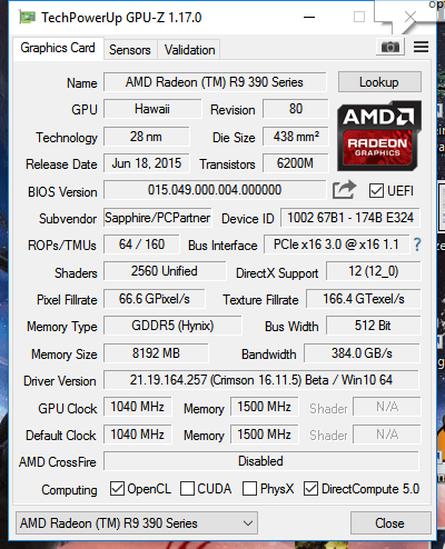 8192MB ATI AMD Radeon R9 390 Series (Sapphire/PCPartner) 46 °C