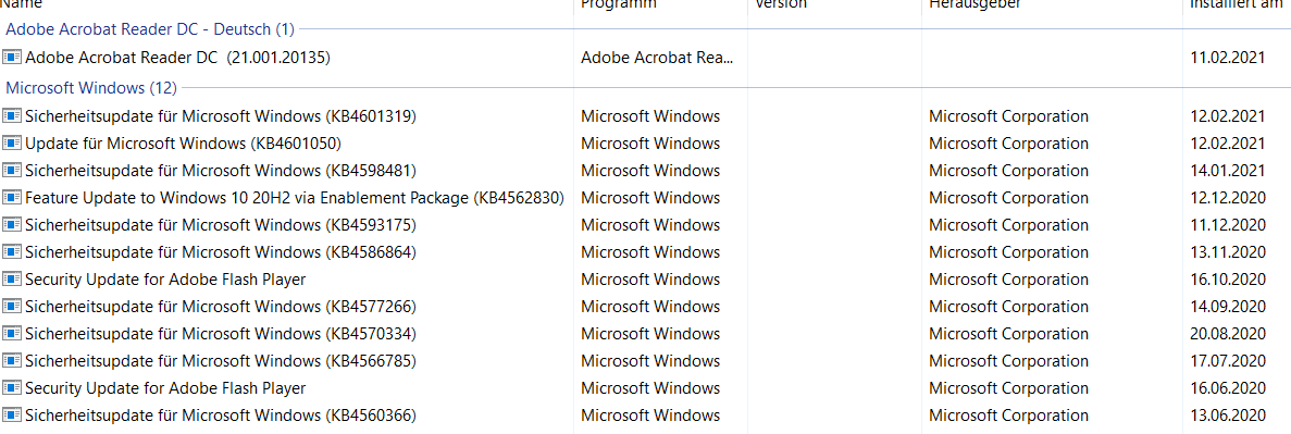 Übersicht über die installierten Updates: