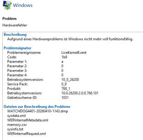 Es fing alles bereits im Sommer letzten Jahres an. Als ich plötzlich immer wieder einen Bluescreen hatte aber sehr sporadisch (manchmal war 2 Wochen nichts). Habe dann ein Bios Update gemacht und es war lange zeit ruhe.