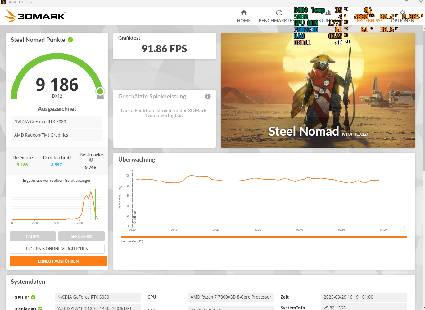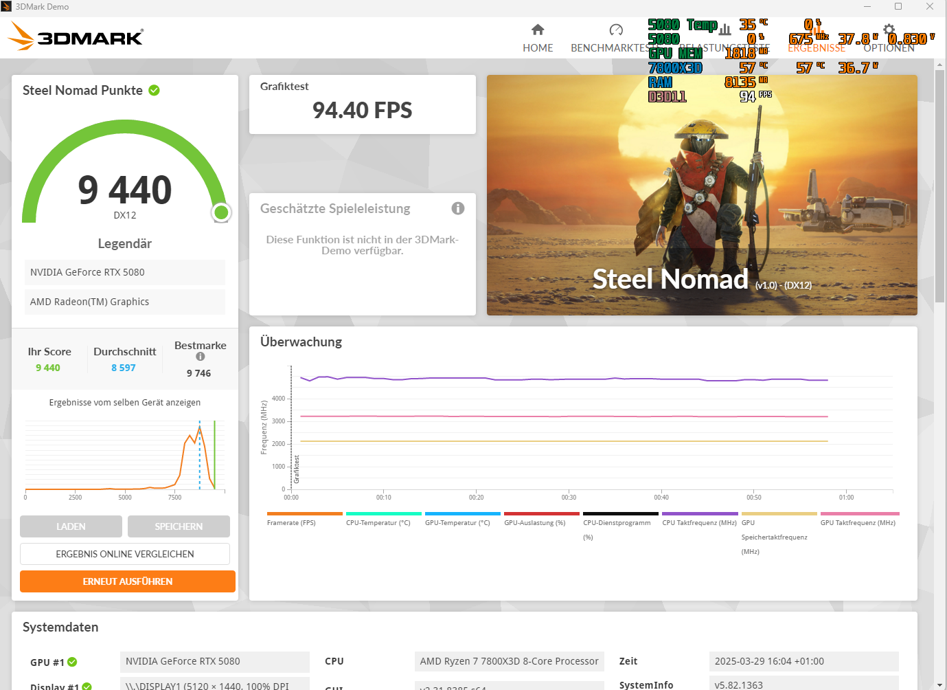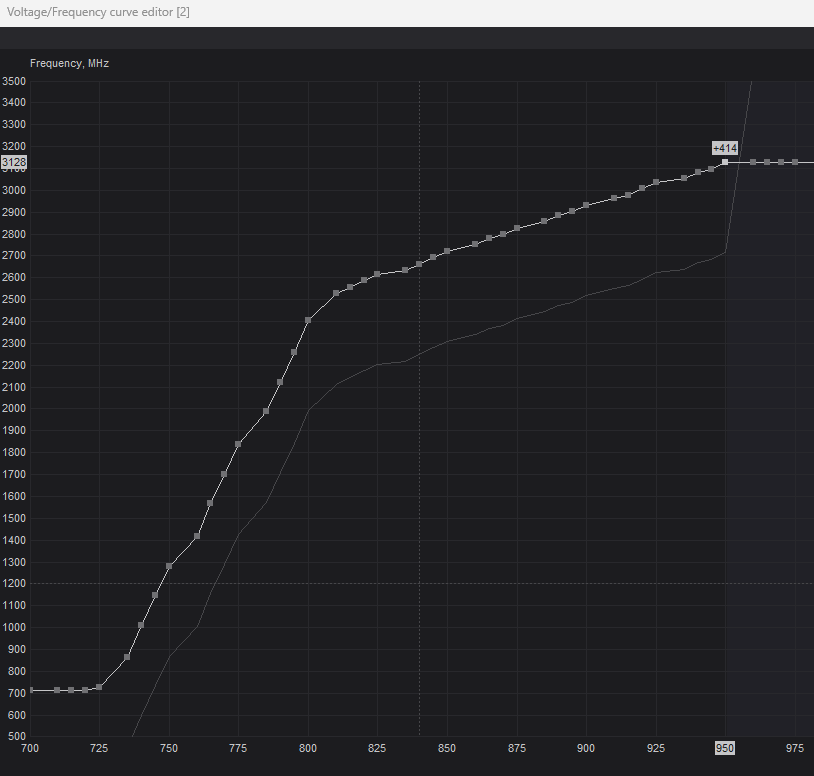 Mit ein bisschen Tweaking würde ich die Karte wahrscheinlich auch auf 9600 Punkte gewürgt bekommen, aber wofür? Viel beeindruckter finde ich die stabilen OC/UV-Results. Mit Peak bei 350W lande ich bei folgendem Score: