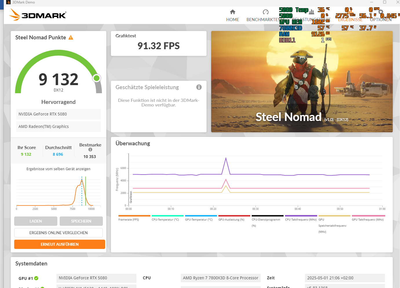 Das Ergebnis ist wirklich nicht gut und als daily mMn. Dank der hohen Spannung ungeeignet. Selbst meine undervoltete 5080 mit nur 0.9V kommt höher bei steelnomad. Setz mal memory auf +2000 und geh mit der Spannung ein wenig runter. Ich bin mir sicher, dass 3.2GHz auch mit 1.0V möglich sind oder gar noch ein bisschen darunter.