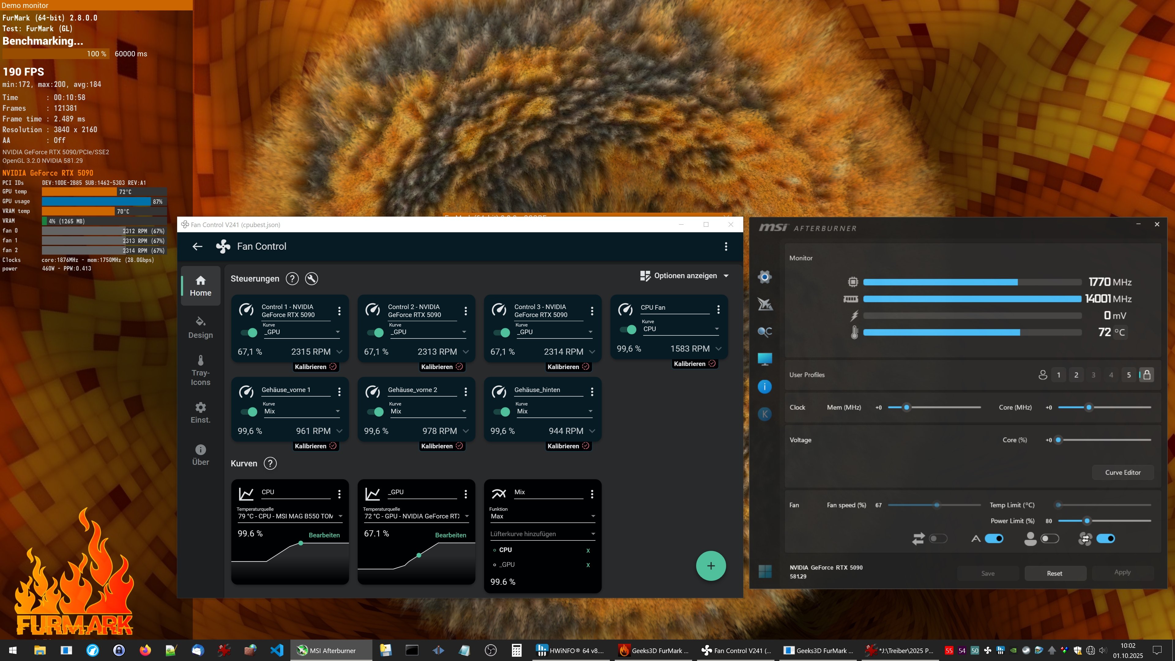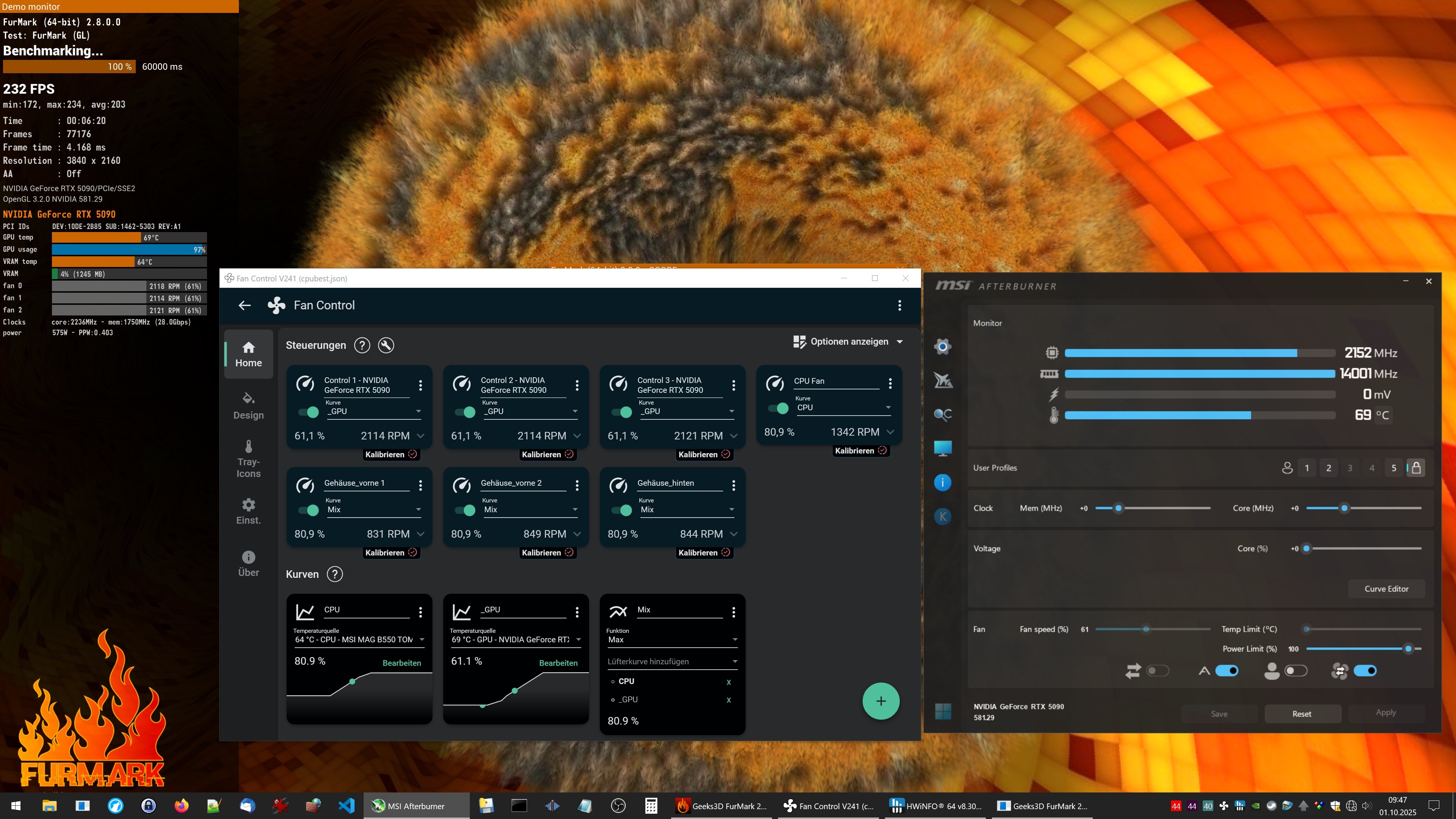 ich hab ein bescheidenes altes atx fractal R5 Gehäuse (2x Lüfter 140 vorne, 1x 140 hinten.) mit MSI MAG B550 TOMAHAWK am4 board, Amd ryzen 7 5800x CPU,64GB RAM, MSI rtx 5090 gaming trio. Ich habs mal ohne Undervolting in offenem Gehäuse getestet und mal mit Undervolting/Powerlimit(69%, 80%) in geschlossenem Gehäuse. Ich hab mich nicht getraut ohne Undervolting in geschlossenem gehäuse mit so schlechter Gehäusebelüftung zu testen. Wie findet ihr die Werte (Leistung ,CPU/GPU Temperatur im Bezug auf Lüferdrehzahl) ?