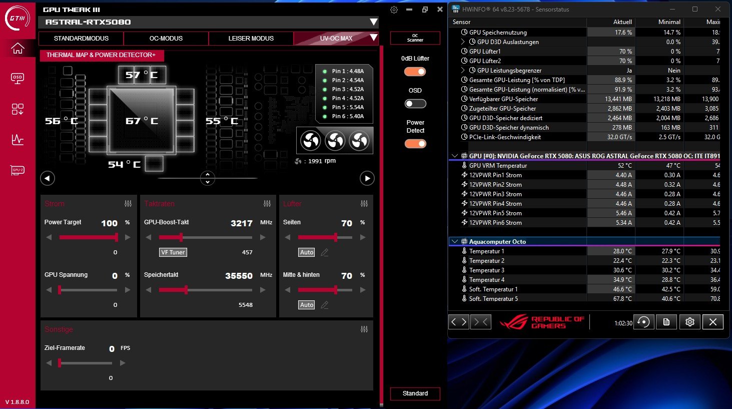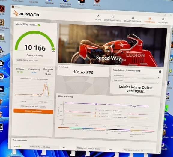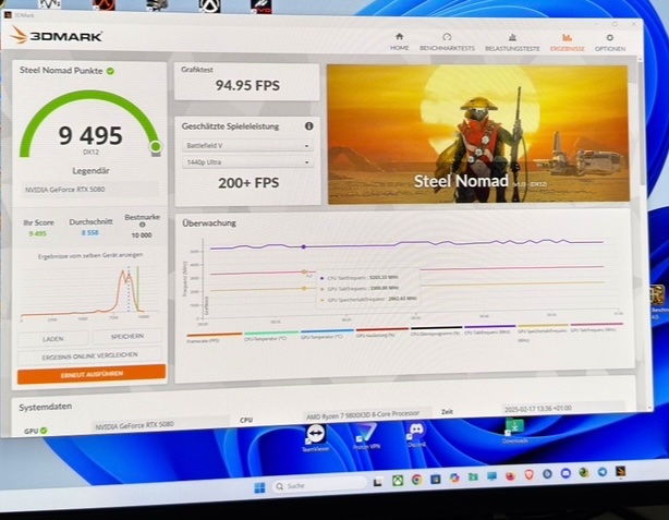 „Offen“ (PL 125%, Core +350, was bei der Aorus 3155 MHz entspricht), kriege ich im Best-Case 340 Punkte mehr in Steel Nomad (+3,7%), wobei es durchaus Durchläufe mit bis zu 130 Punkten weniger gab. Dem gegenüber steht ein Mehrverbrauch von im Schnitt etwa 70 Watt (round about 390W mit Peak auf 419W), was 20,5% entspricht.