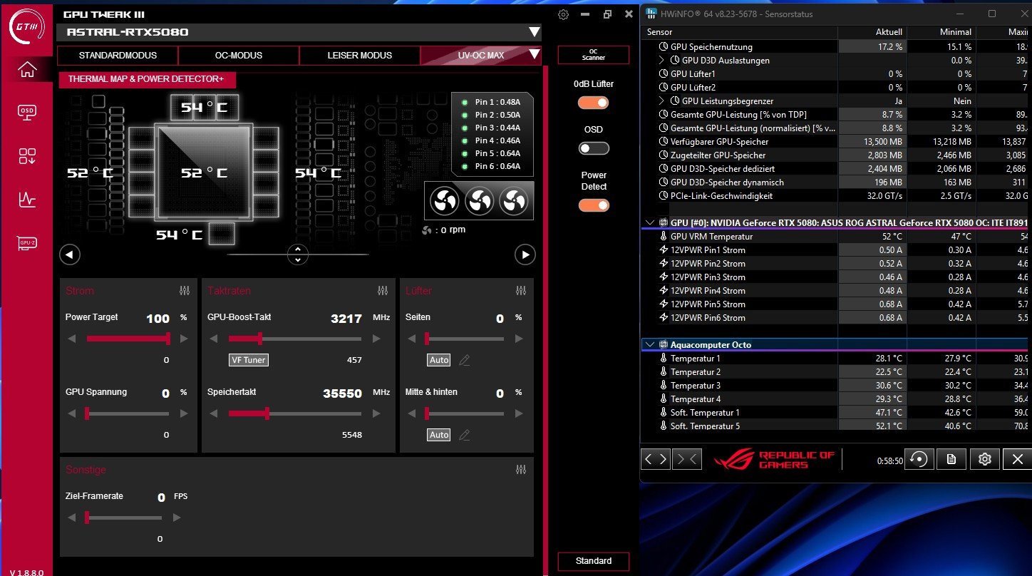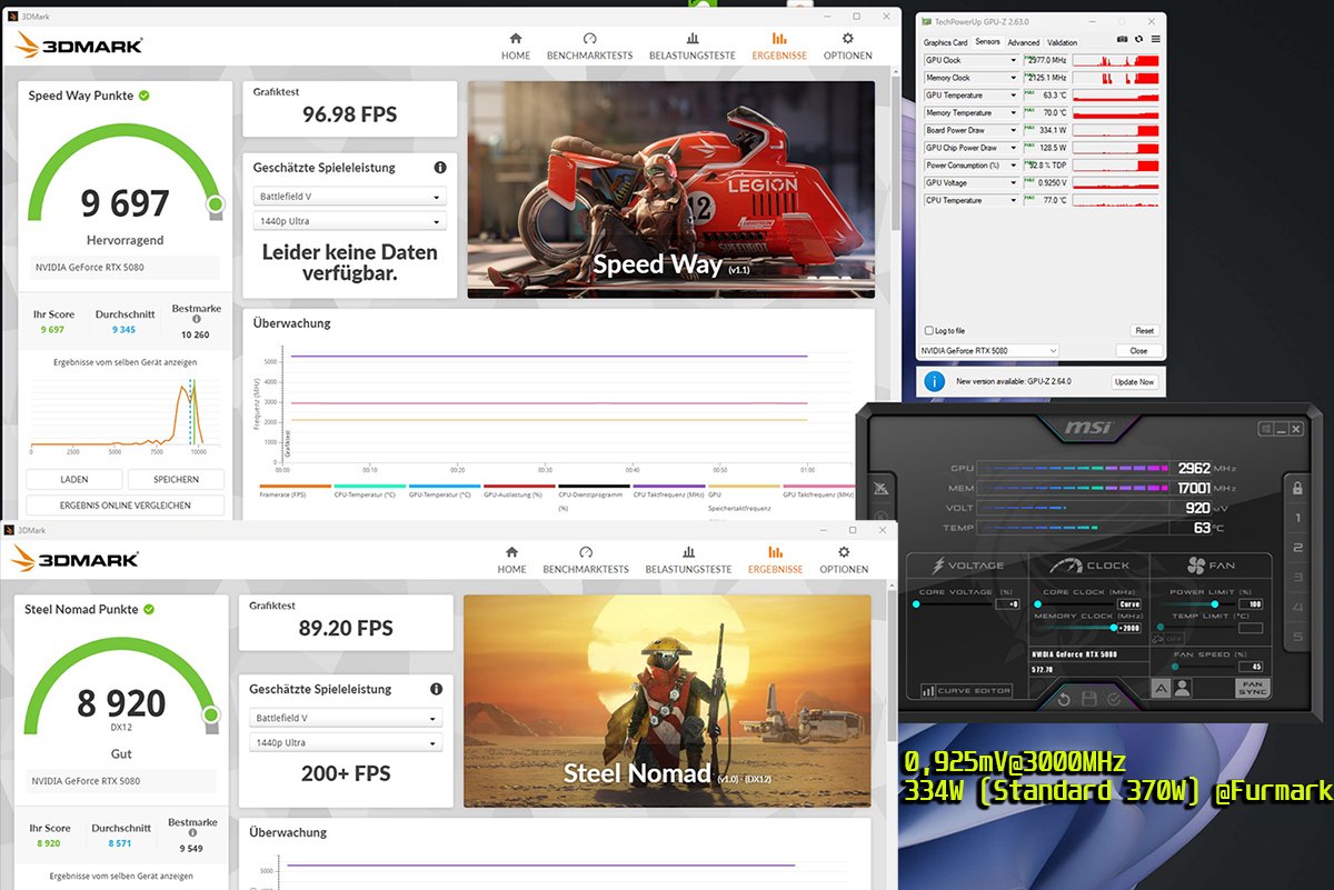 Bei +2000 Memory lande ich so bei Steel Nomad bei 9140 Punkten (realer Takt 3045MHz bei 0,940V) und einem Verbrauch im Bereich 320 Watt mit seltenen Peaks aus 340W.