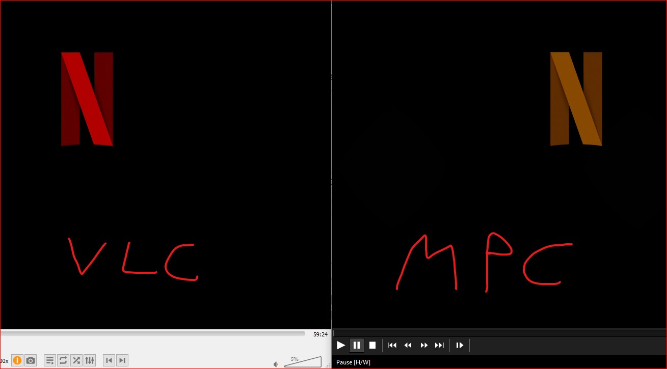 Die Unterschiede zwischen VLC und MPC sind deutlich erkennbar, insbesondere bei dem "N" auf der rechten Seite.