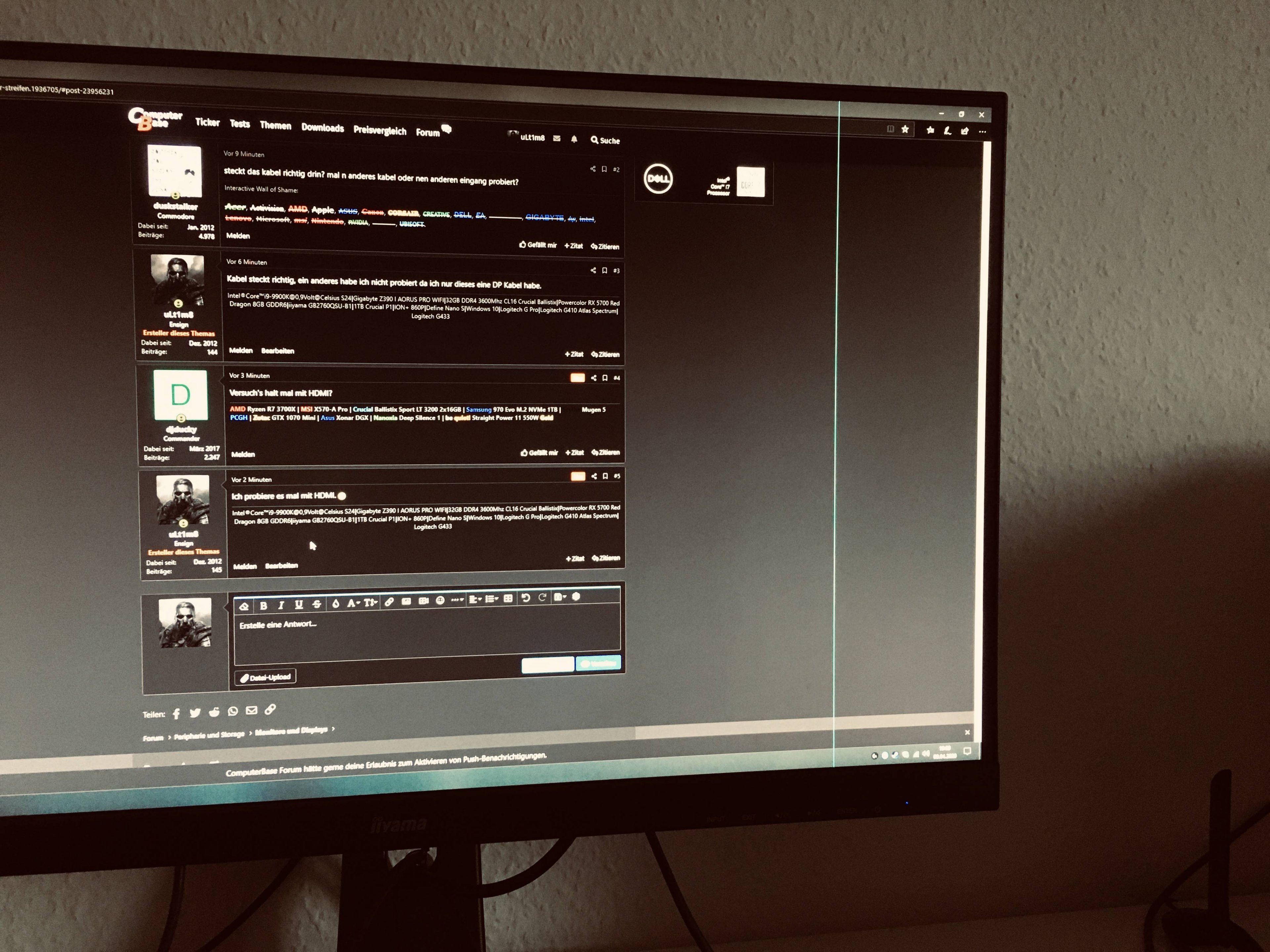 ich habe sporadisch einen blauen dünnen Streifen auf der rechten Seite des Monitors (vertikal).