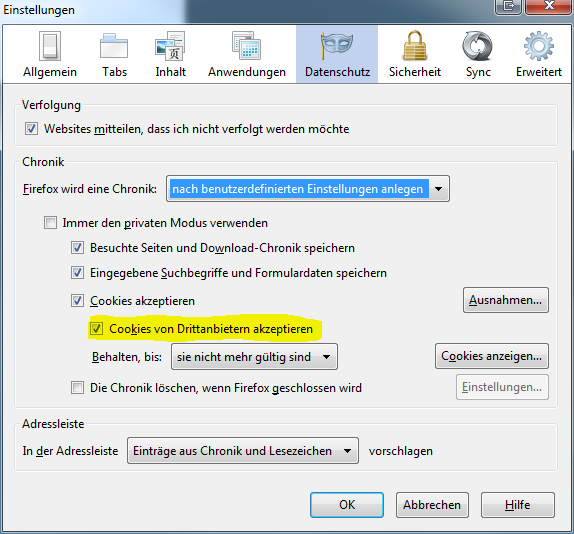 Um an die Einstellung zu kommen, muss man die Chronik auf benutzerdefiniert umschalten.