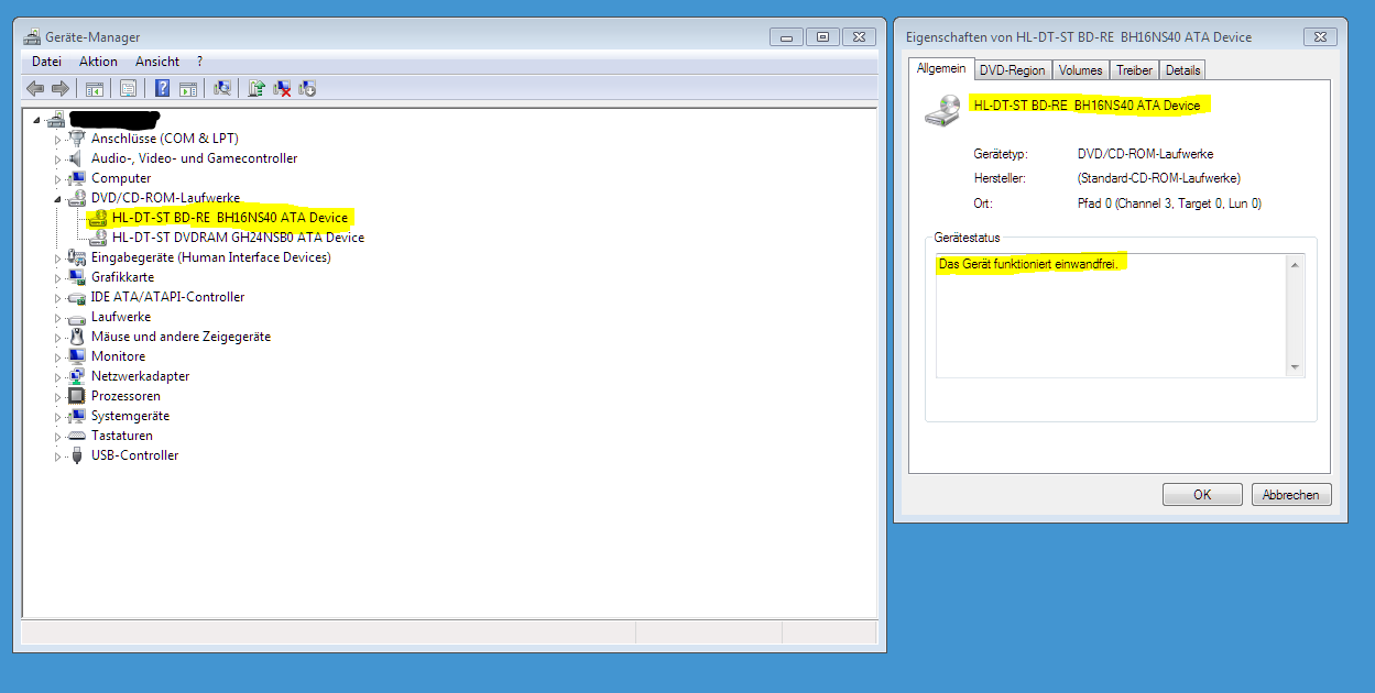 Ich habe die Kabel ausgetauscht und die DVD und Blu Ray Anschlussmöglichkeiten am Mainboard gewechselt. Ohne Wirksamkeit der Funktion des Blu Ray Laufwerks.
