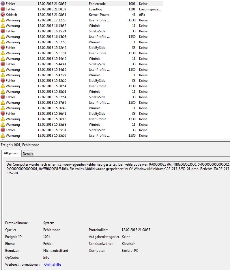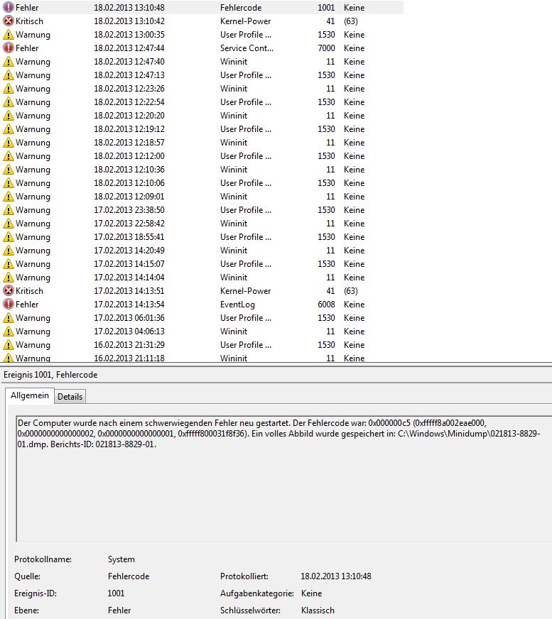 Der Computer wurde nach einem schwerwiegenden Fehler neu gestartet. Der Fehlercode war: 0x000000c5 (0xfffff8a003063000, 0x0000000000000002, 0x0000000000000001, 0xfffff800031f8406). Ein volles Abbild wurde gespeichert in: C:\Windows\Minidump\021213-8252-01.dmp. Berichts-ID: 021213-8252-01.