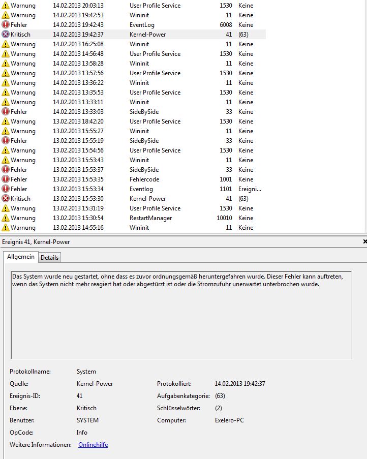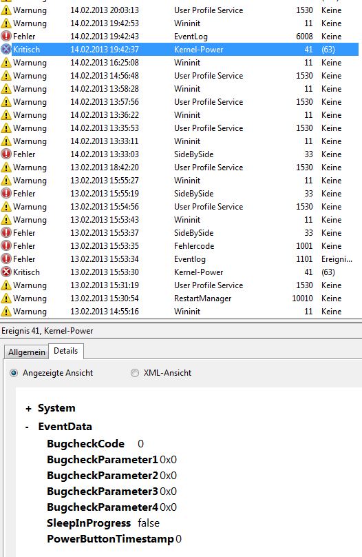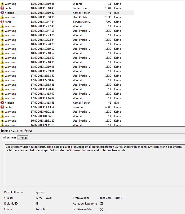 Ich bekomme die Meldung mit normal getaktetem und übertaktetem Prozessor, mit Corsair DDR3-1600 und G.Skill DDR3-1866 Speicher, mit nvidia GTX 560 Ti und AMD Radeon HD 7950. Langsam weiß ich nicht mehr, was ich noch austauschen soll.