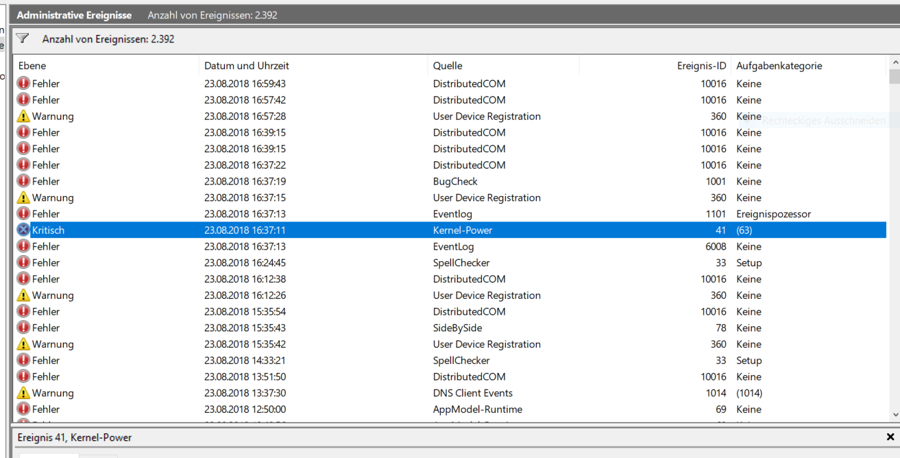 habe daraufhin mal in der Ereignisanzeige nachgeschaut und gesehen, dass sich einige Warnungen und Fehler tummeln...: