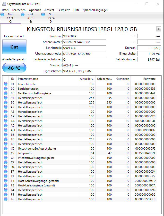 Dann weiter mit den SMART werten der Festplatten... Zu bekommen mit Crystal Disk Info.