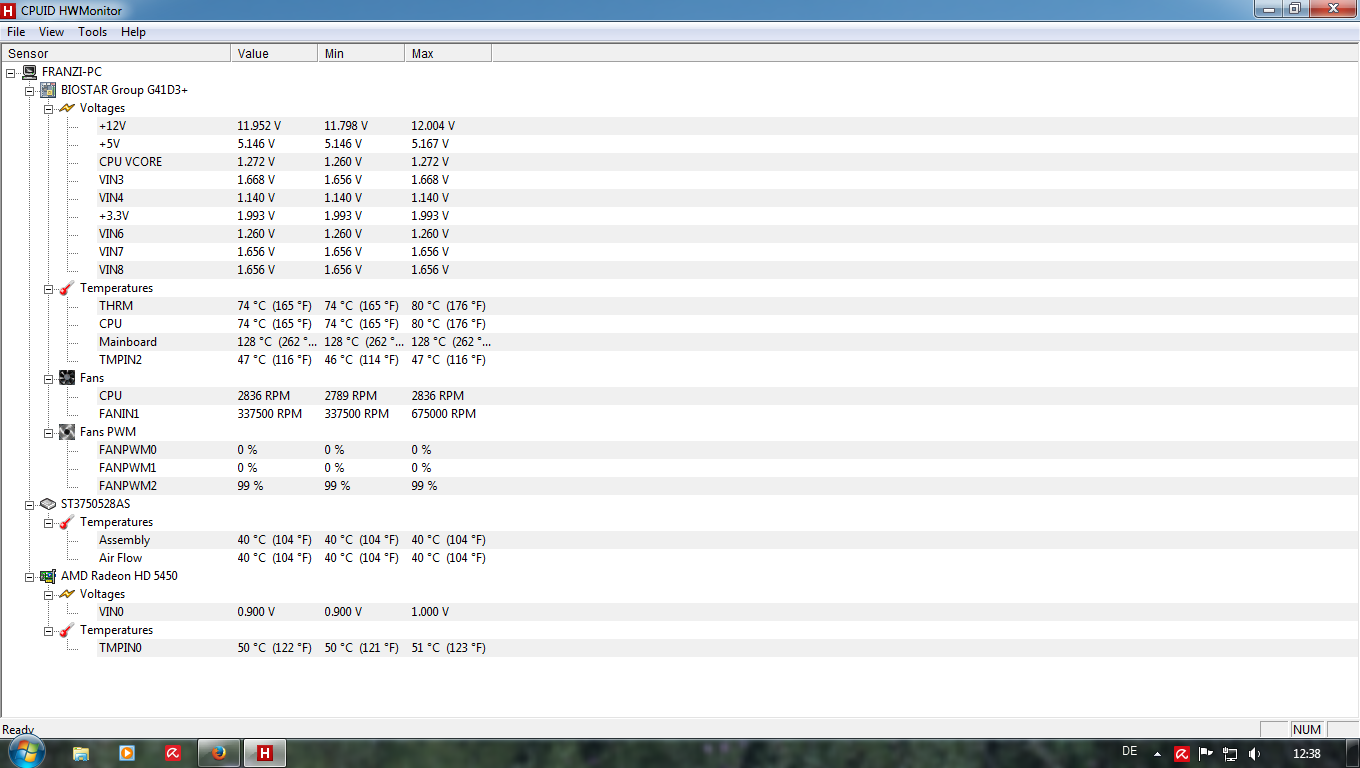 Entweder liefert HWMonitor an dieser Stelle wirklich ganze 3 Messfehler (+3,3V ist zu niedrig, Temperatur mit 128 °C zu hoch und auch der eine Lüfter mit 337.000 rpm) oder es ist wirklich etwas größeres kaputt.