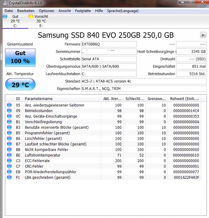 SSD: Samsung 840 EVO 250gb Zustand: gut (grün) lt. Samsung Magician <- hierauf ist Windows 7, Spiele und Programme installiert.