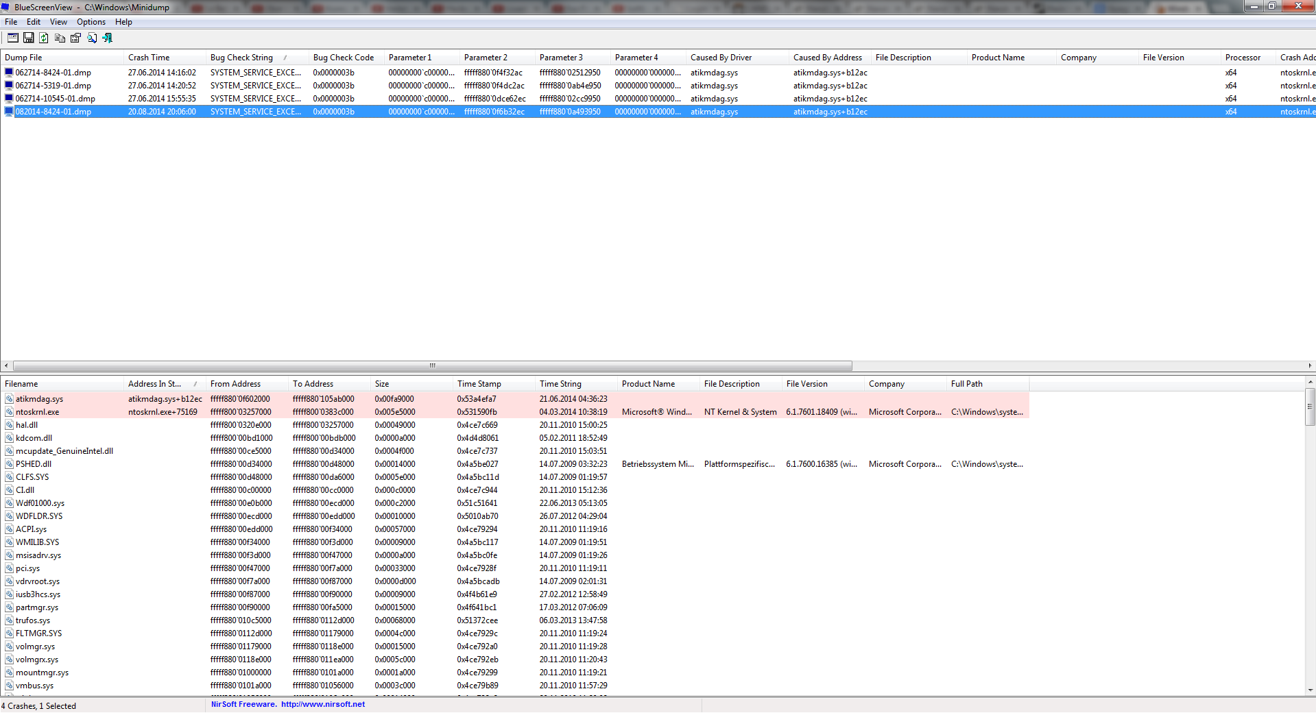 Ich habe in letzter Zeit ca alle 7 Tage einmal einen Bluescreen. Gerade hatte ich wieder einen allerdings wurde anscheinend kein Dumpfile erstellt (Bei BlueScreenView wird nur der von vor 8 Tagen angezeigt, ich denke aber mal, dass der Grund der selbe ist). Ich poste einfach mal einen Screen (hoffentlich von dem richtigen Bereich) von BlueScreenView. Darüber hinaus kommt es mir so vor als würde der Bluescreen immer auftreten, wenn ich gerade viele Tabs (20-30) in Chrome offen habe.