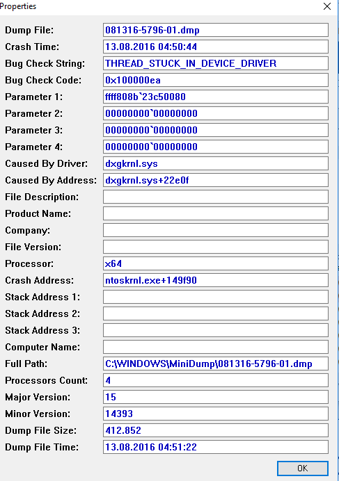 Der Computer wurde nach einem schwerwiegenden Fehler neu gestartet. Der Fehlercode war: 0x000000ea (0xffff808b23c50080, 0x0000000000000000, 0x0000000000000000, 0x0000000000000000). Ein volles Abbild wurde gespeichert in: C:\WINDOWS\MEMORY.DMP. Berichts-ID: 45f3dbb0-5027-4e17-b97a-826ae50122d9.