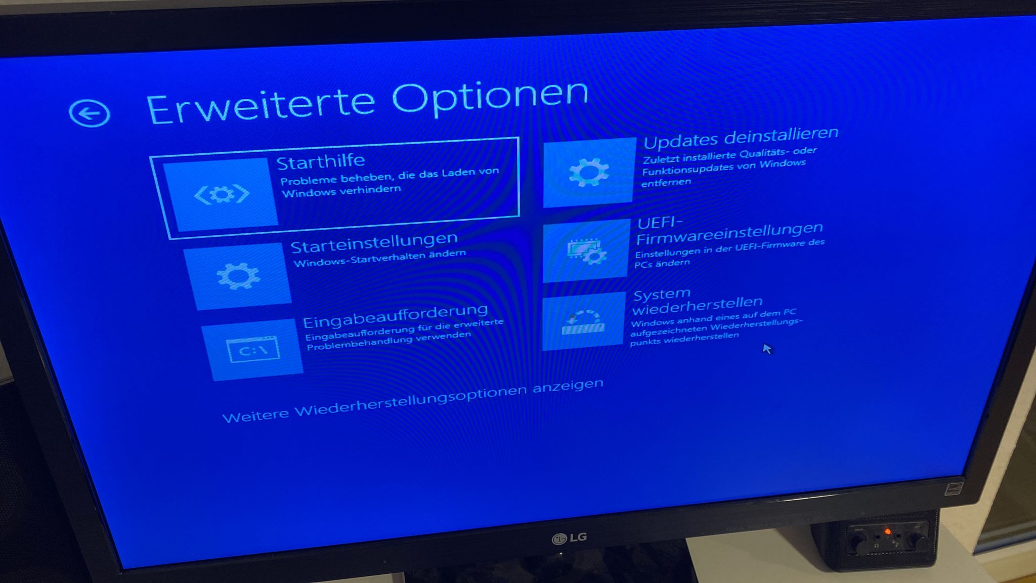 Nach einem Neustart kommt er in die Automatische Reperatur mit den Optionen: