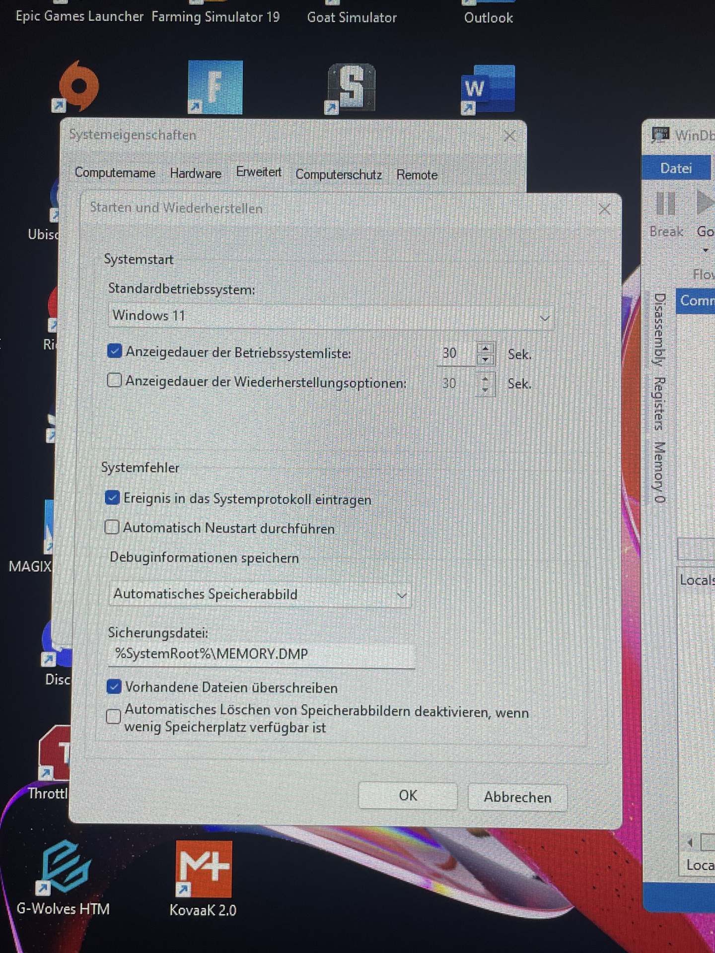 "Automatisch Neustart ausführen" bedeutet hier nur,Silver Server schrieb:Stelle Deinen Rechner so ein das Du eine Dumpfile erhältst