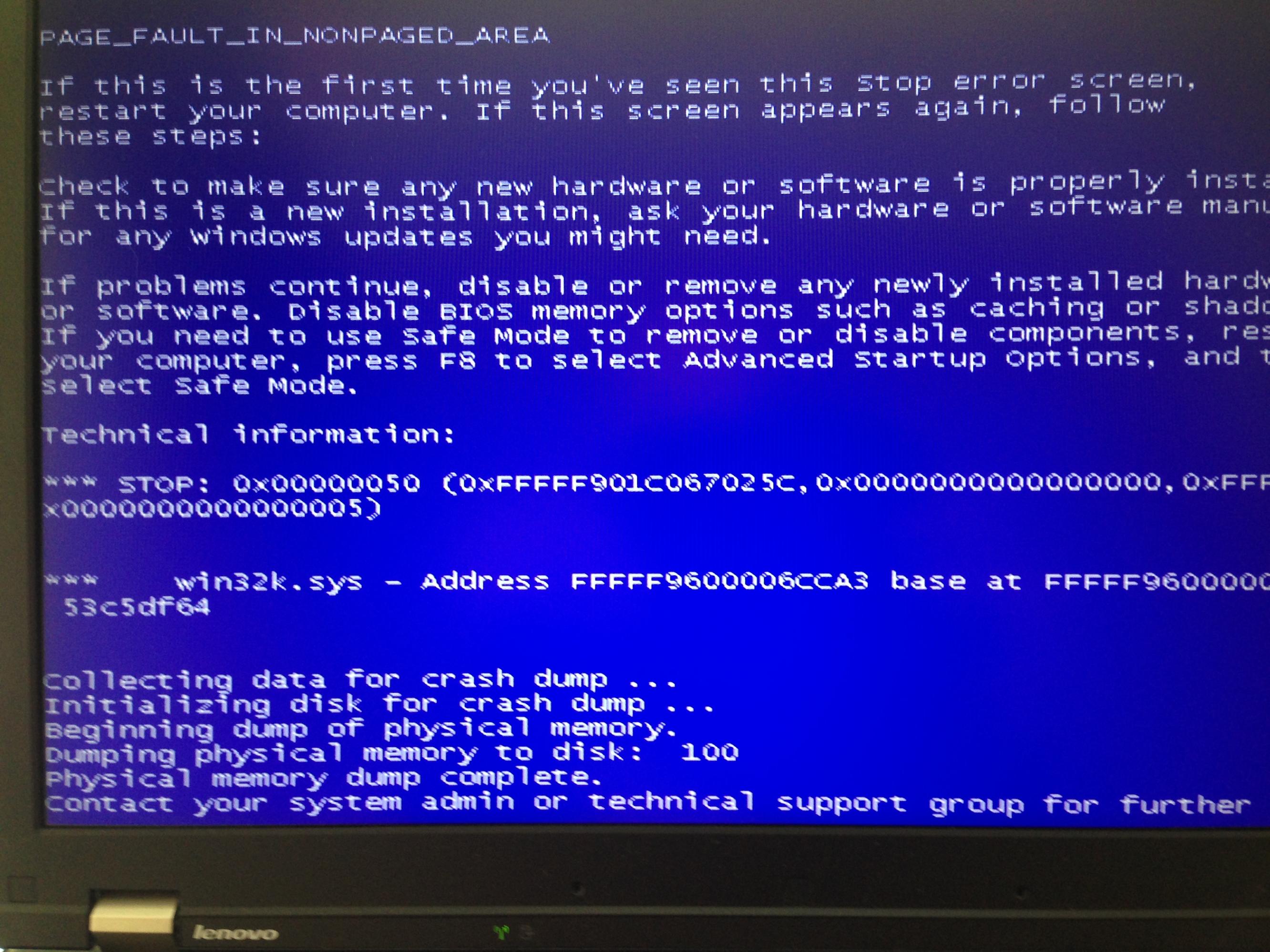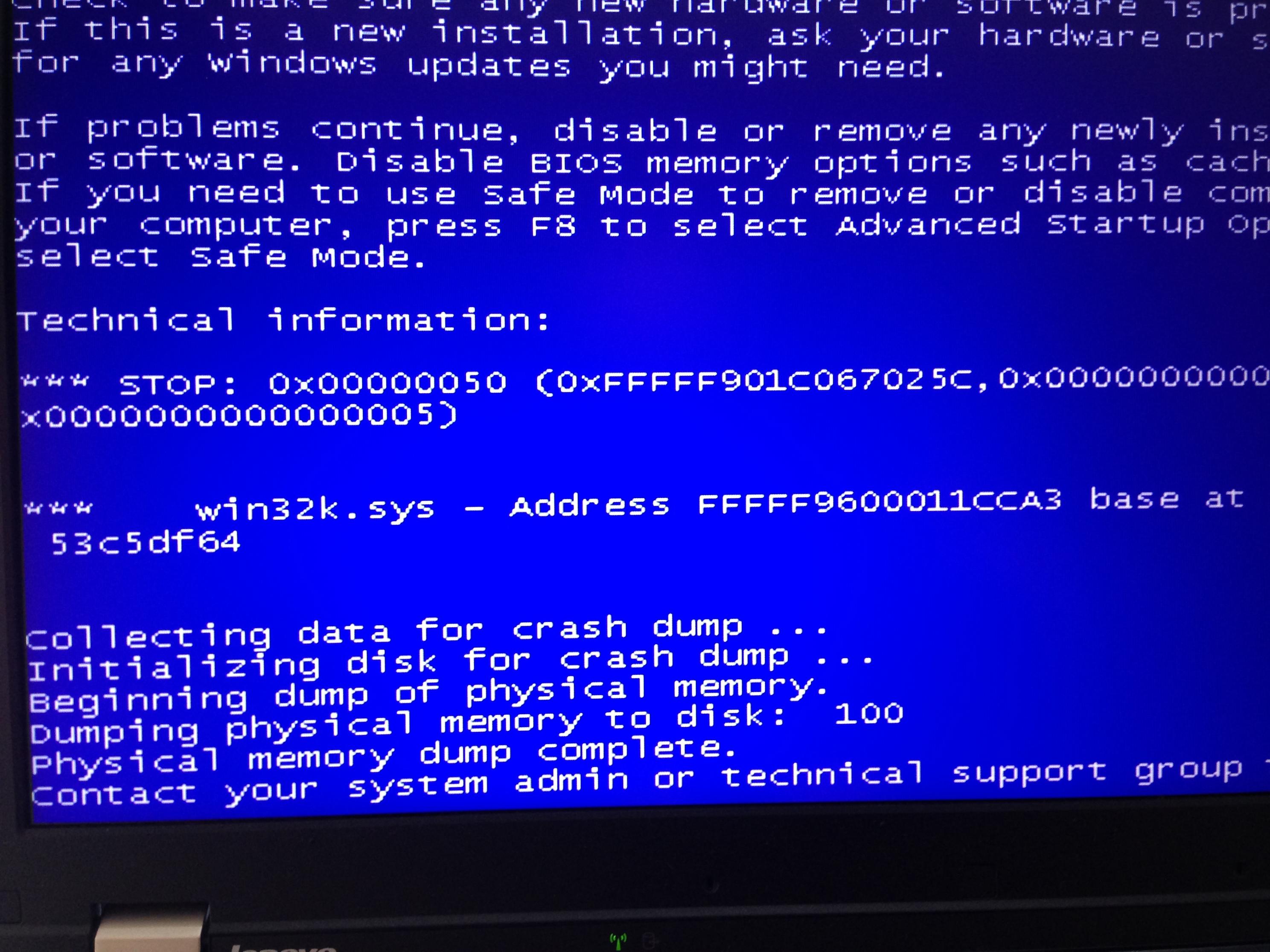 Es kommt immer die Meldung beim Hochfahren "STOP: 0x00000050" etc etc - siehe Screenshots bzw. ...win32k.sys.
