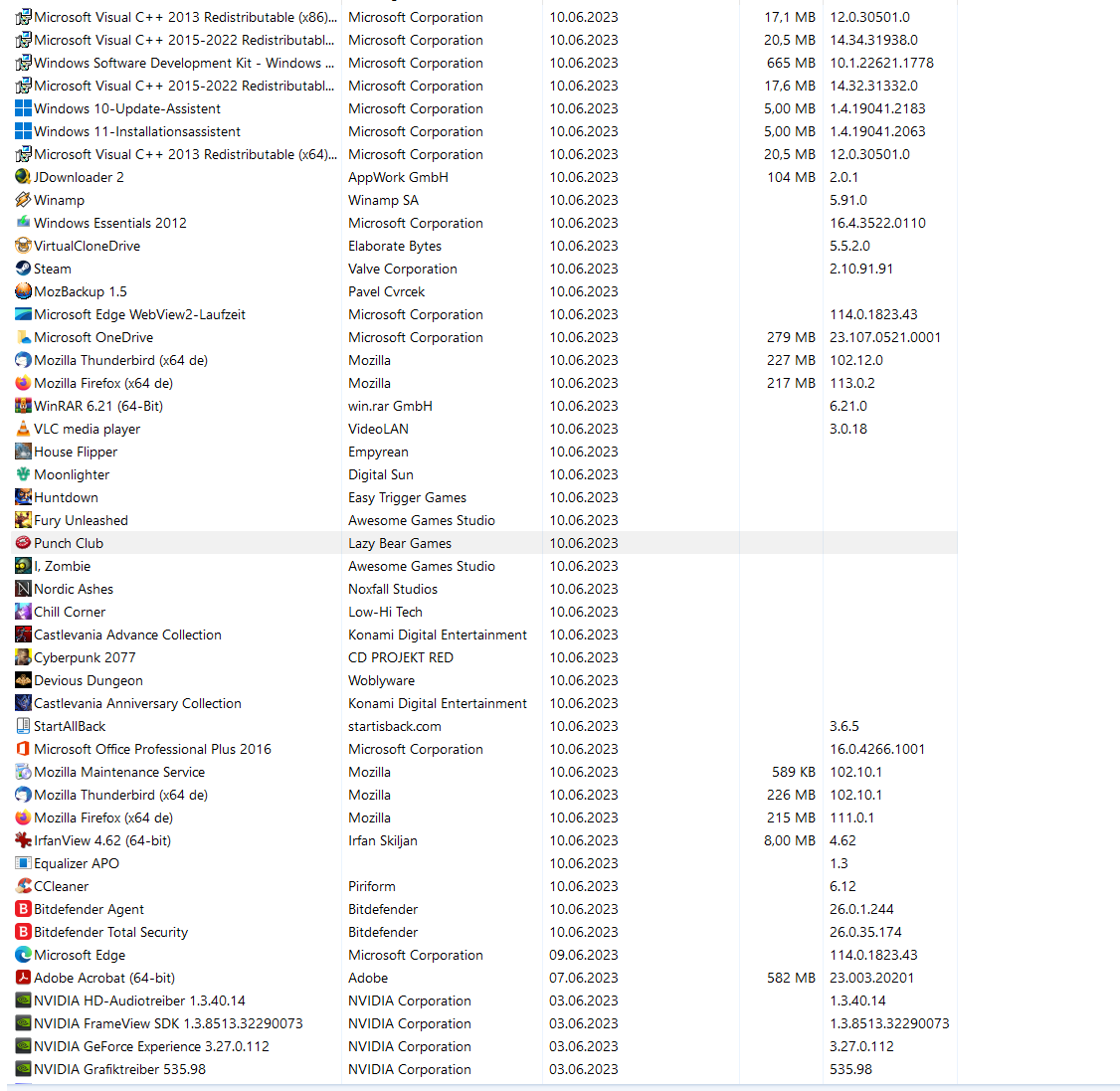 Ich habs mal gemacht allerdings stimmt das Datum der gesamten Installationen vom 10.06. nicht. Einiges ist schon seit April drauf.Redundanz schrieb:und dann am besten nach "installiert am" sortieren, neuste ganz oben.