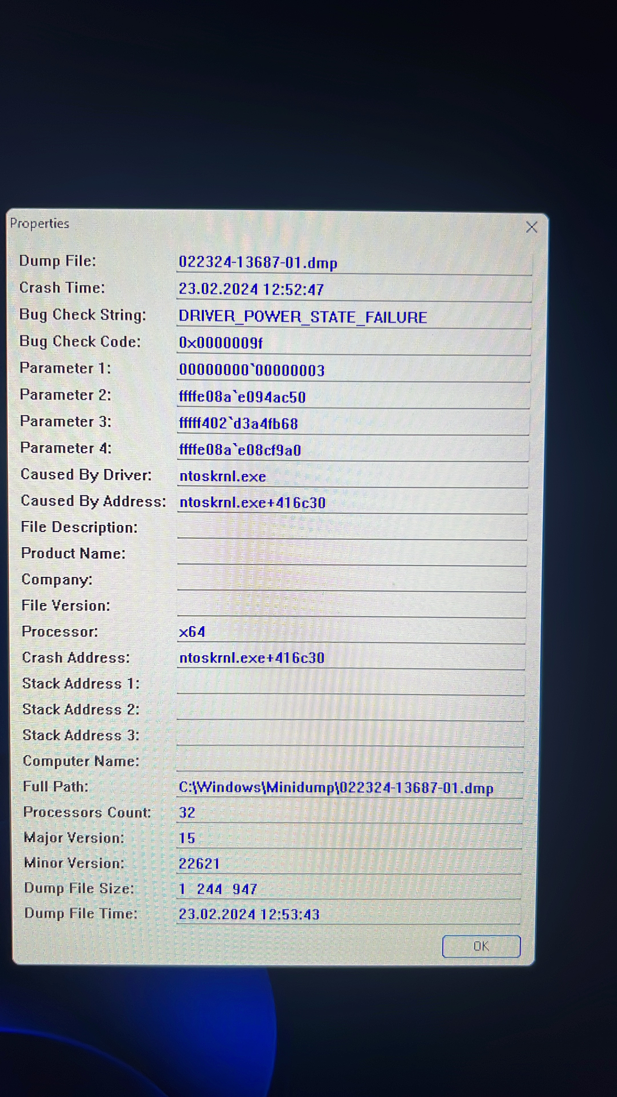 Mini Kernel Dump File: Only registers and stack trace are available