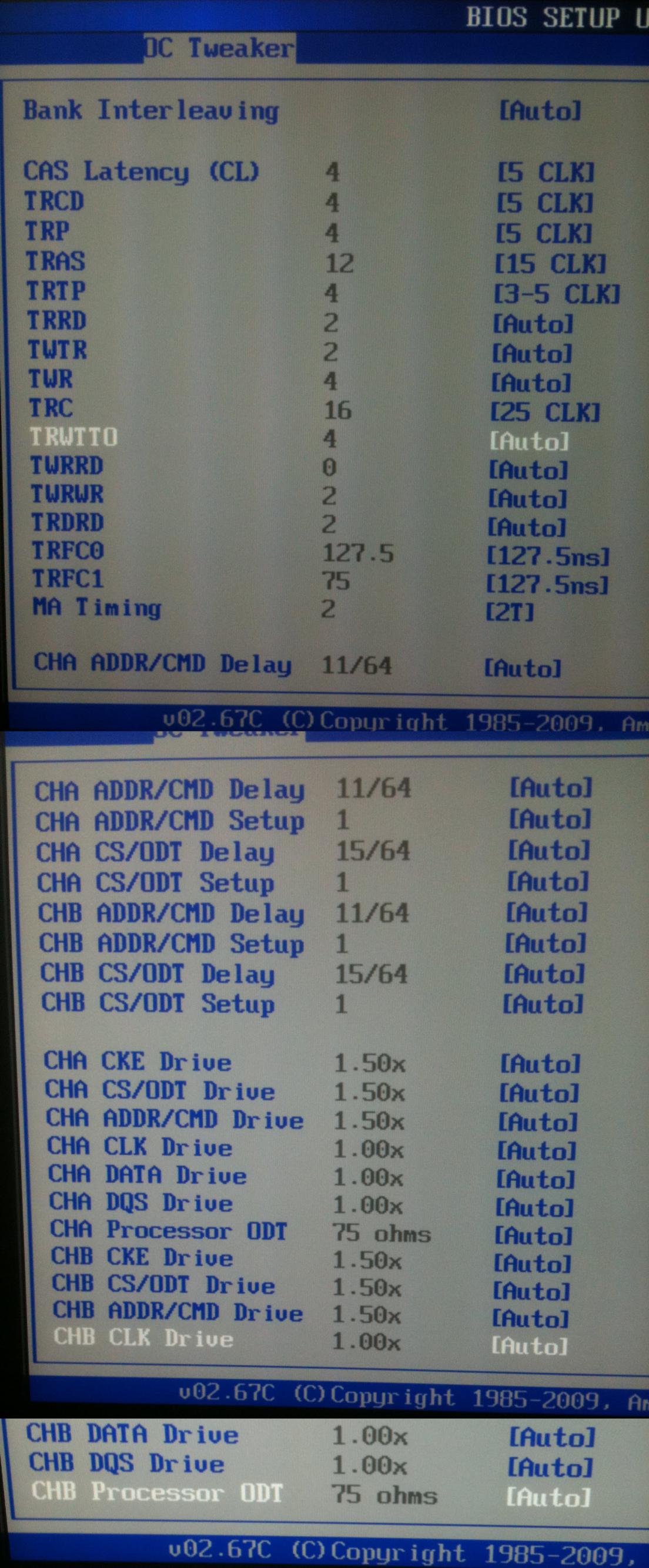 Deshalb lade ich euch mal eine Fotokollage meiner BIOS-Einstellungen hoch mit der Bitte um sachdienliche Hinweise. Die grauen Zahlen sind die Werte, die das BIOS als default nimmt, rechts davon die tatsächlich (z.T. von mir also veränderten) Einstellungen.