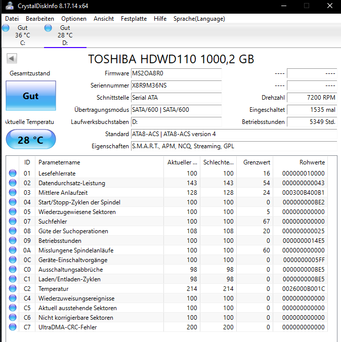 Hier die CrystalDiskInfo Screens