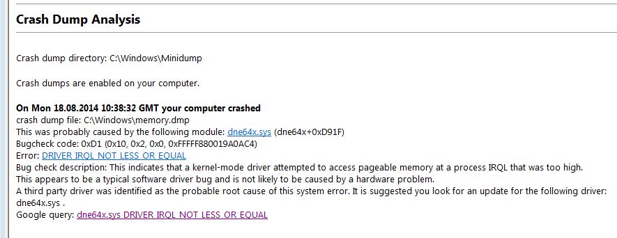 Für mich bedeutet das, dass der Fehler an einem Treiber liegt und dessen Datei "dne64x.sys".