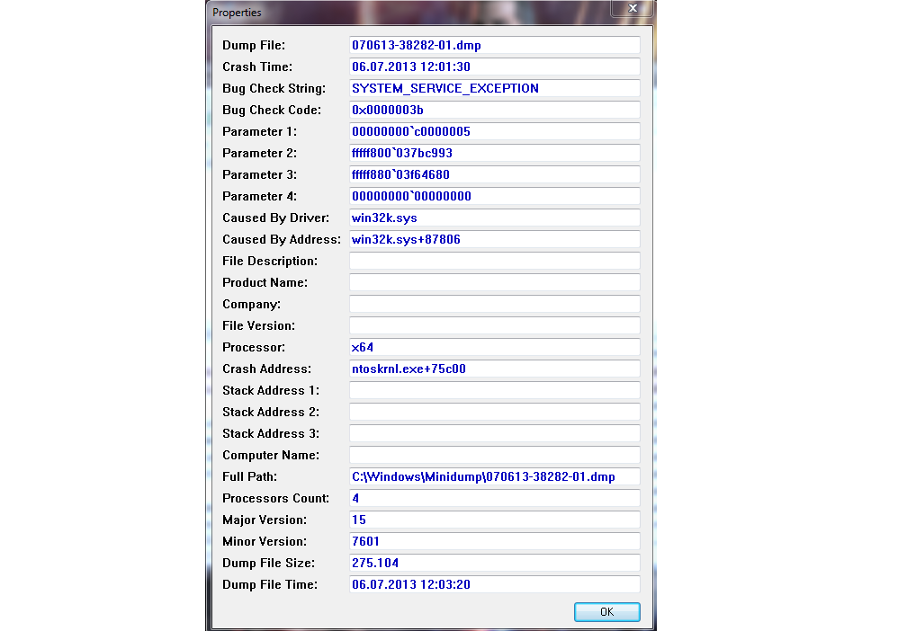 3. Der Computer wurde nach einem schwerwiegenden Fehler neu gestartet. Der Fehlercode war: 0x00000024 (0x00000000001904fb, 0xfffff880033d6298, 0xfffff880033d5af0, 0xfffff88001622d77). Ein volles Abbild wurde gespeichert in: C:\Windows\MEMORY.DMP. Berichts-ID: 070413-51386-01.