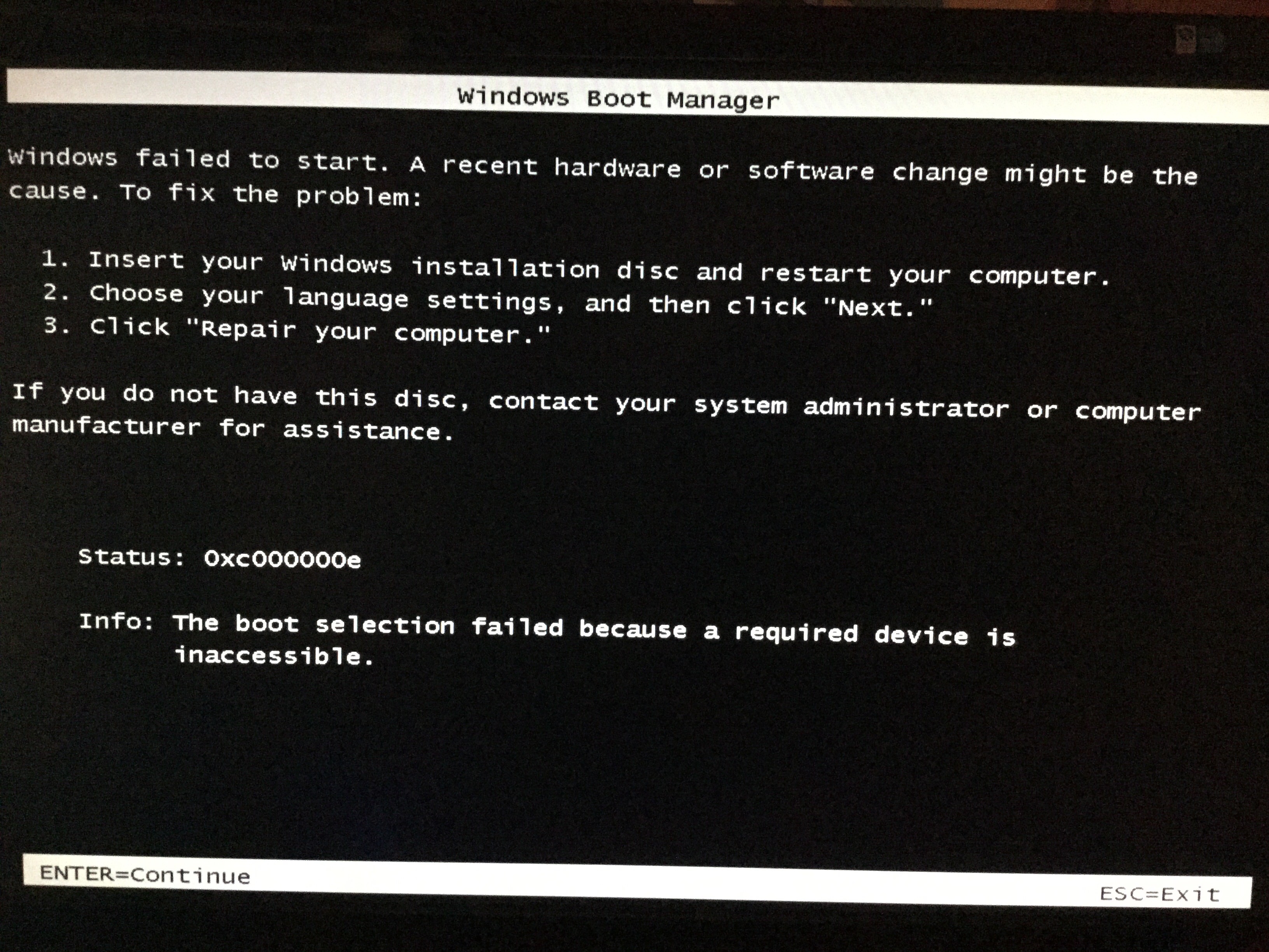 Ich habe ebenfalls schon versucht eine Systemreparatur mit einer Windows 7 CD zu machen, beim starten mit dieser CD erscheint jedoch auch nur die bereits oben genannte Fehlermeldung.