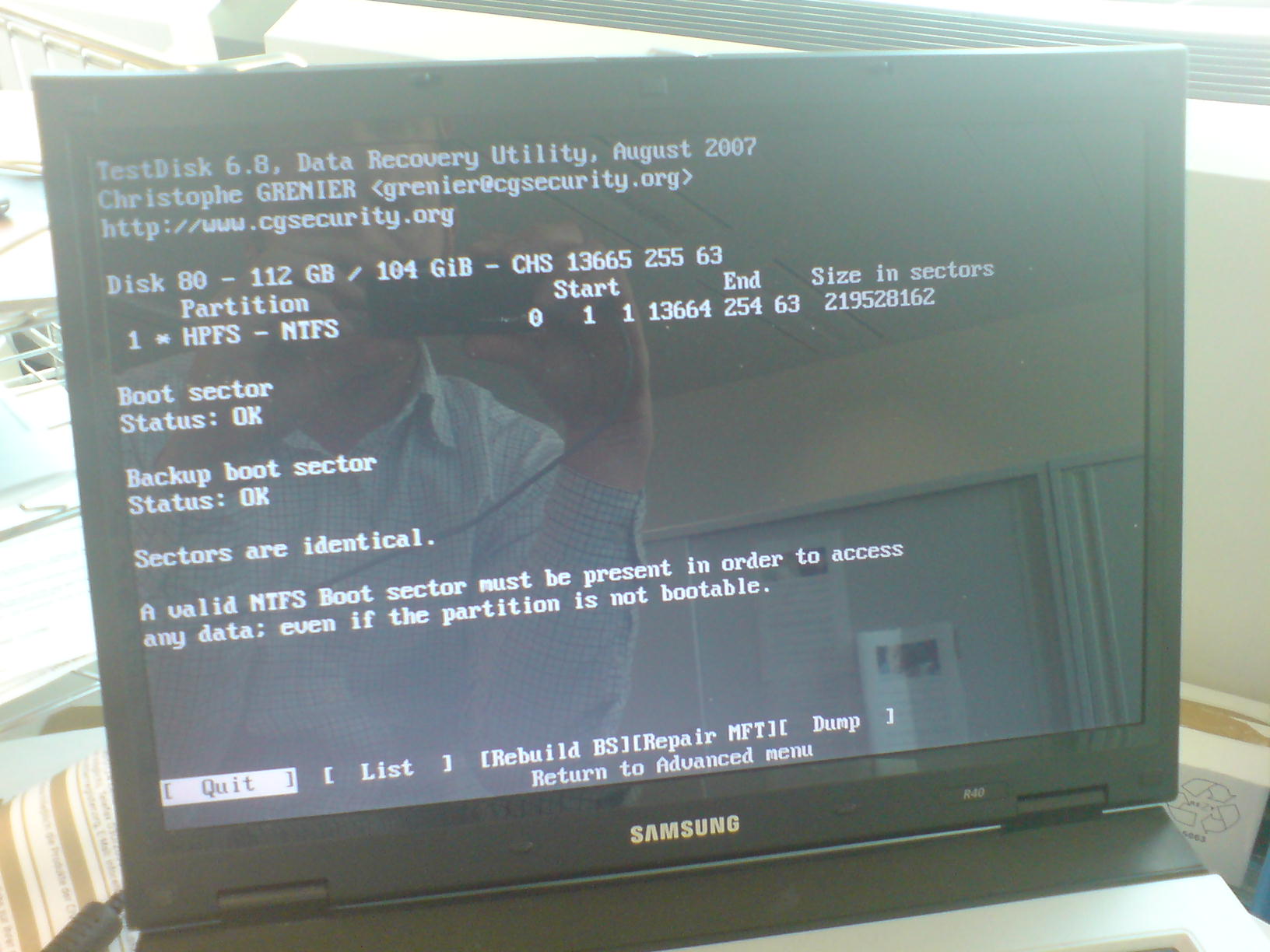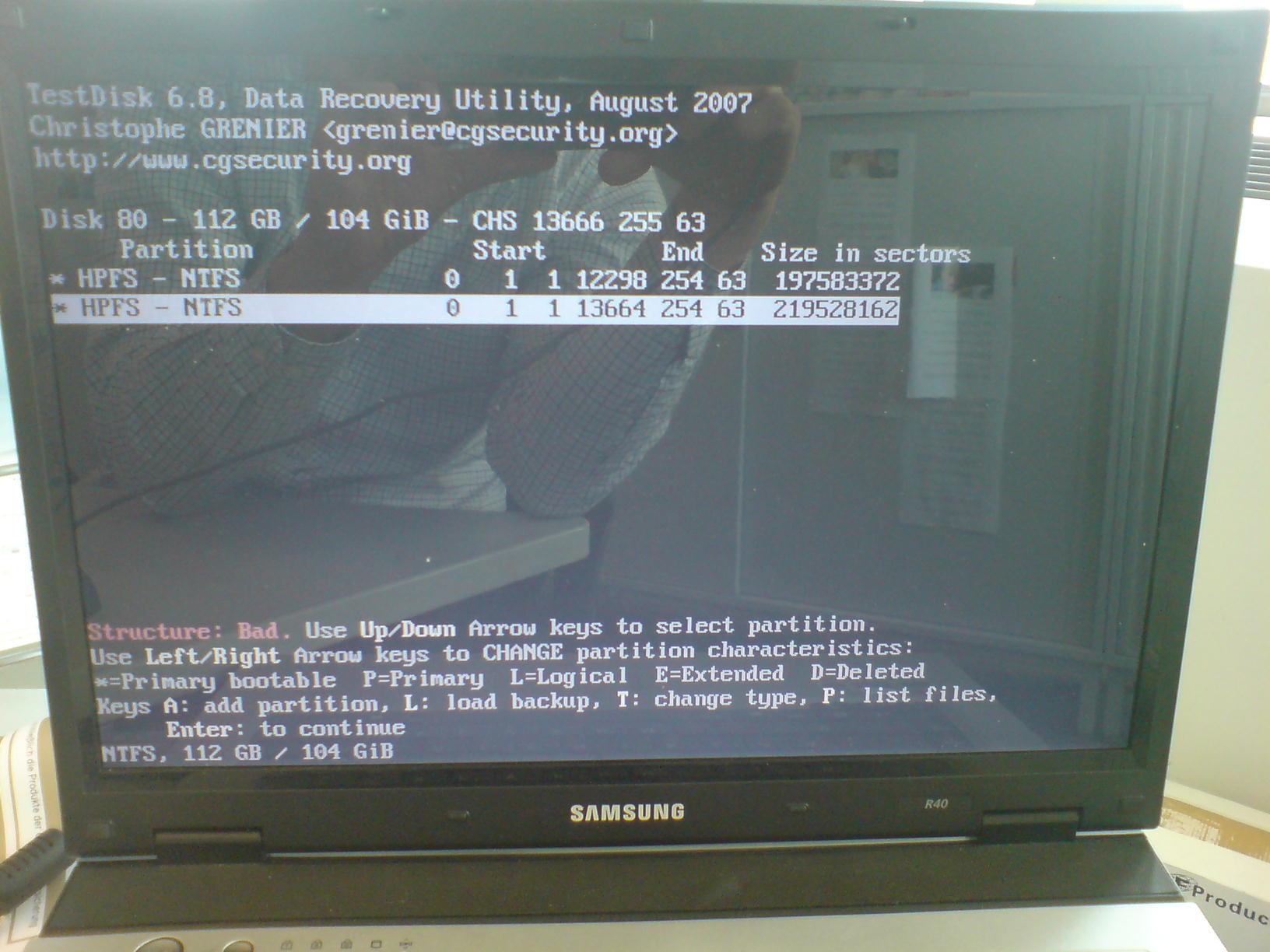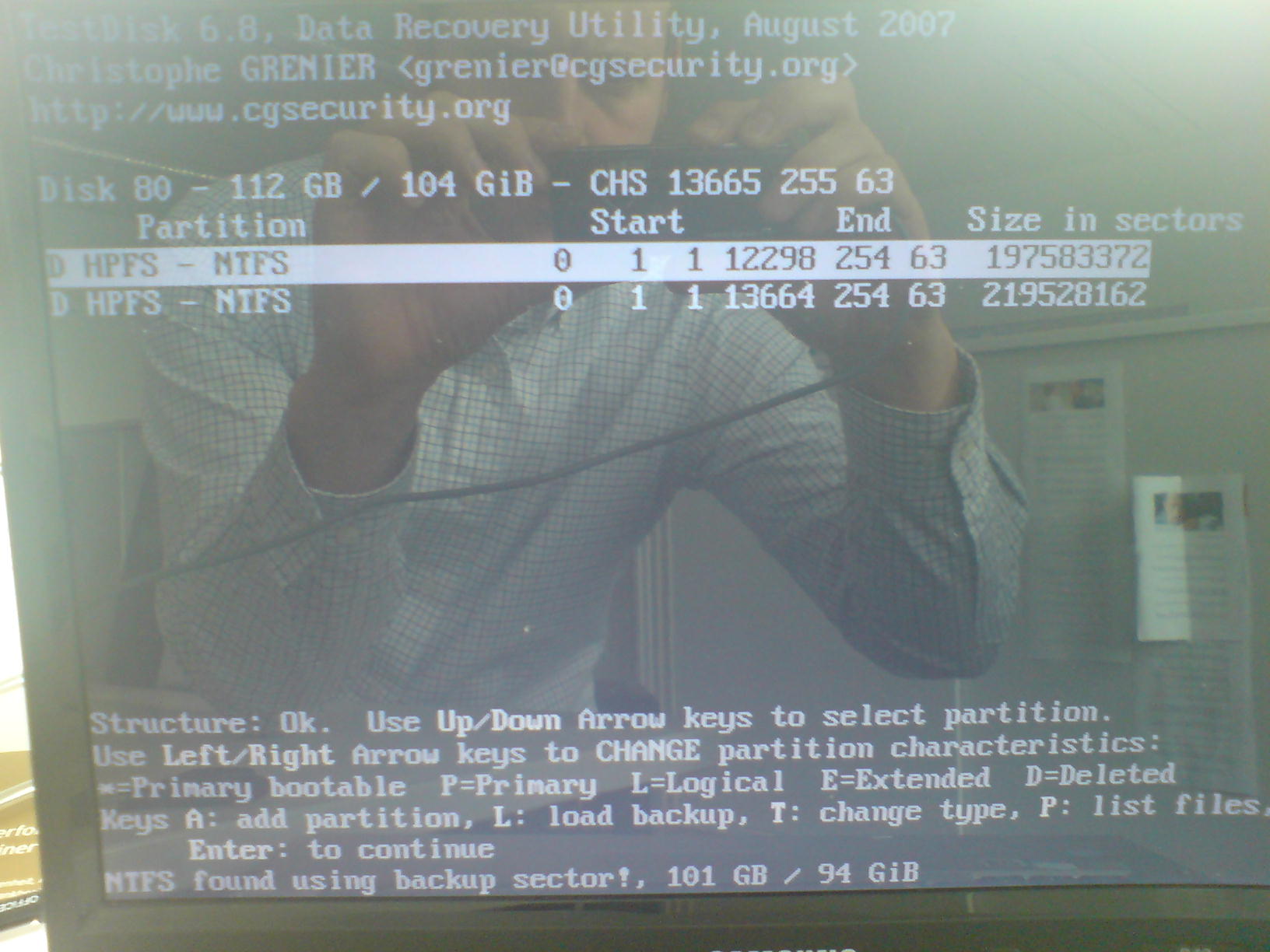 Erstens hast Du noch nicht geschrieben ob Du mit P, für list Files (die Partitionen, die gelistet werden können mit den Cursor-Tasten angewählt werden), Deine Daten gesehen hast und zweitens werden zwei Partitionen gelistet, wobei die erste davon (0 1 1 12298 254 63 197583372) sich mit der zweiten (0 1 1 13664 254 63 219528162) überschneidet. Hier wäre interessant, ob Recovery-Partitionen etc. auf der Platte sein könnten, die dann z.B. weg wären, wenn man den zweiten Eintrag für die Wiederherstellung heranziehen würde.