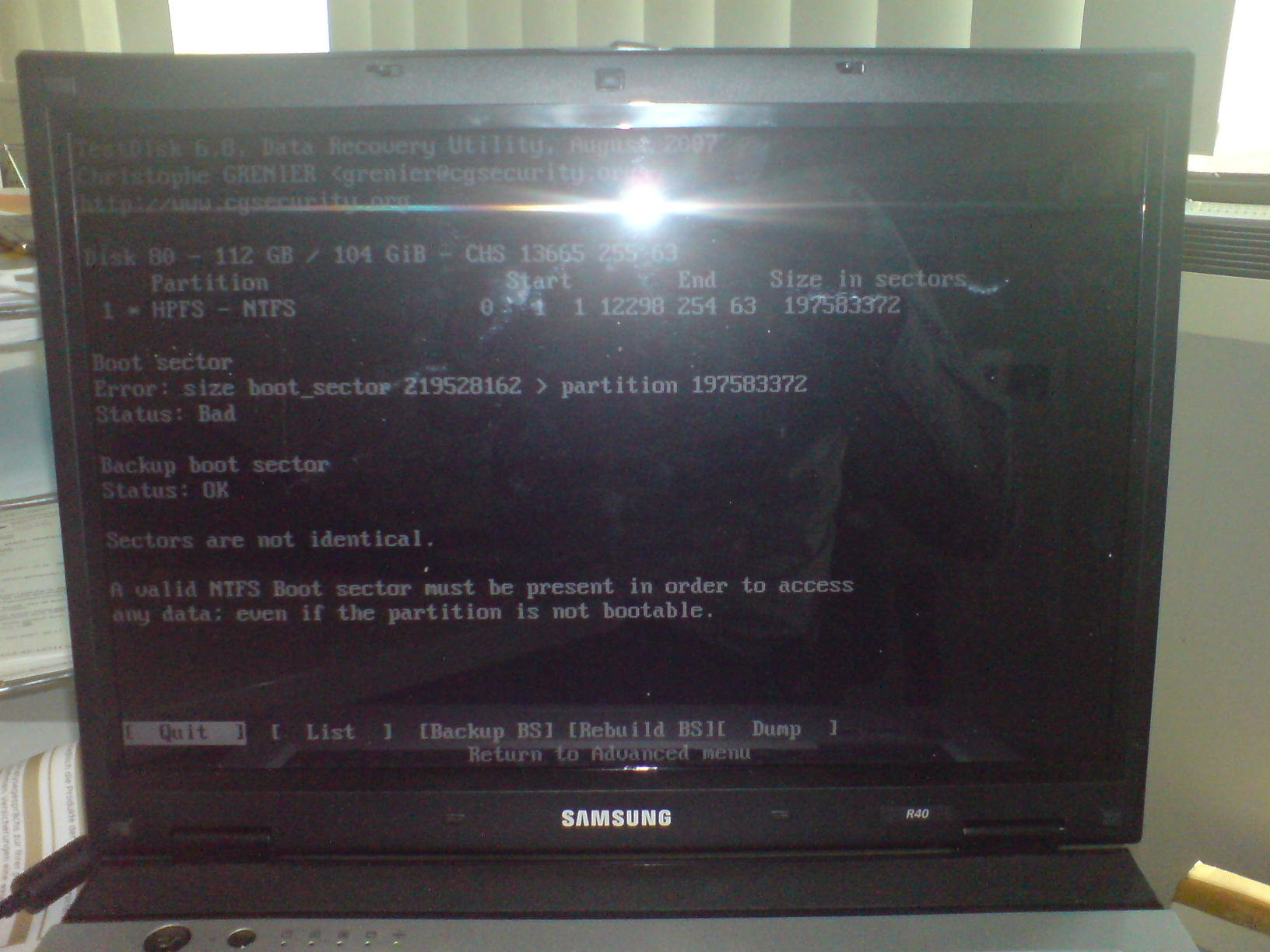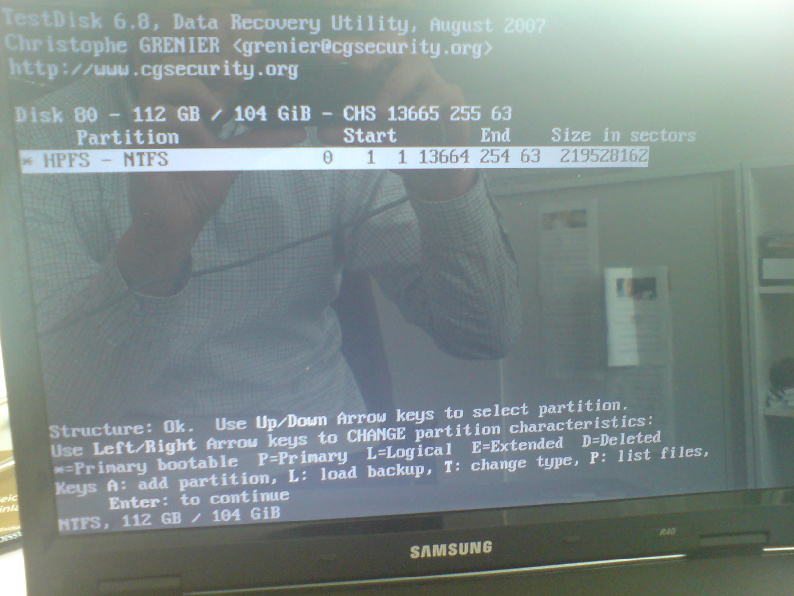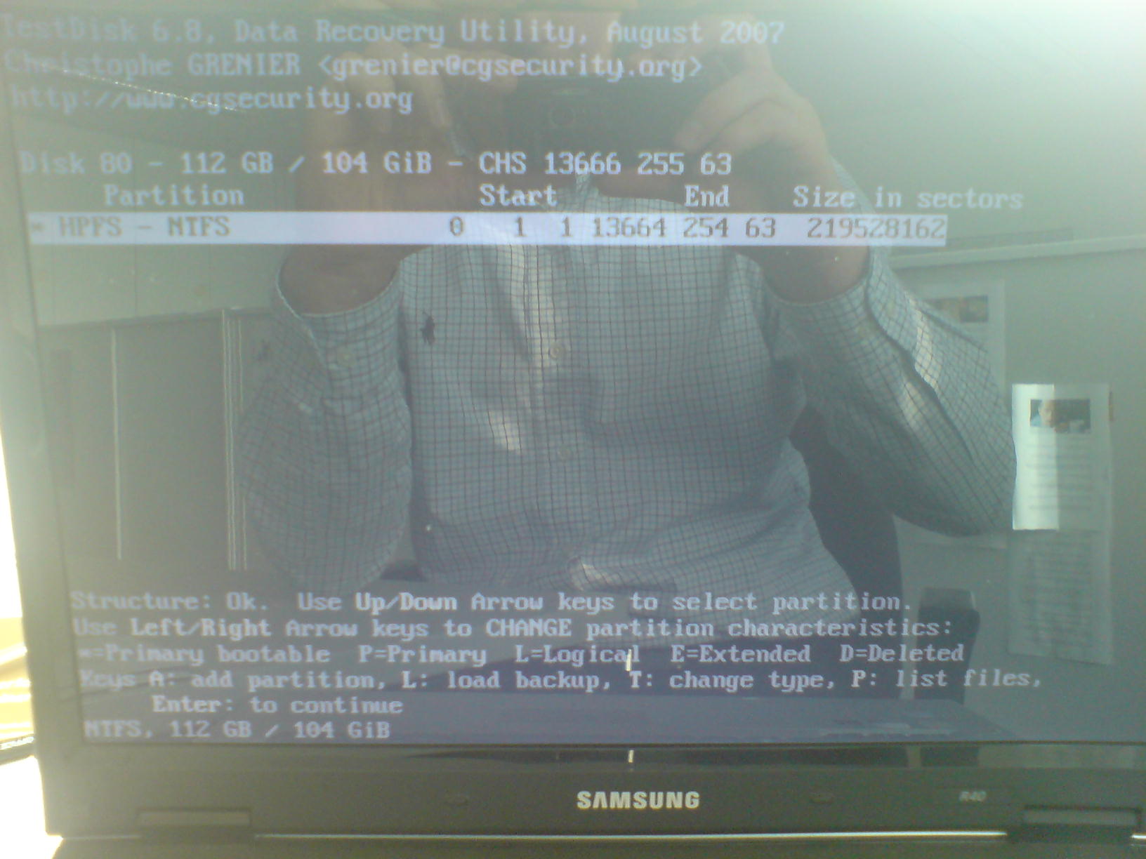 Erstens hast Du noch nicht geschrieben ob Du mit P, für list Files (die Partitionen, die gelistet werden können mit den Cursor-Tasten angewählt werden), Deine Daten gesehen hast und zweitens werden zwei Partitionen gelistet, wobei die erste davon (0 1 1 12298 254 63 197583372) sich mit der zweiten (0 1 1 13664 254 63 219528162) überschneidet. Hier wäre interessant, ob Recovery-Partitionen etc. auf der Platte sein könnten, die dann z.B. weg wären, wenn man den zweiten Eintrag für die Wiederherstellung heranziehen würde.