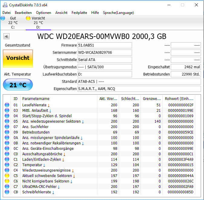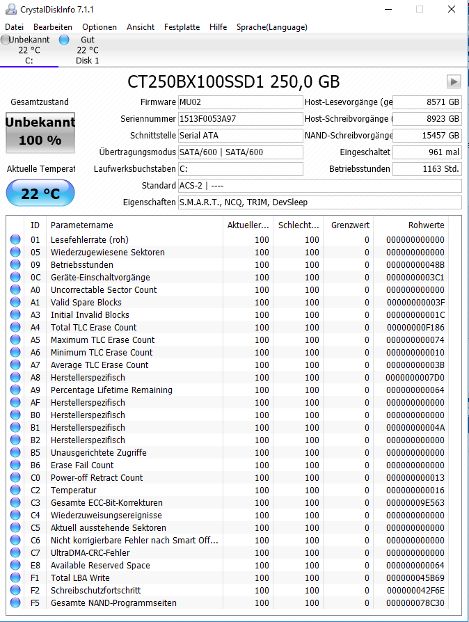 Diese zeigt jedoch seit 1 Jahr Fehler in Crystaldisk an im Bereich C5 & C6