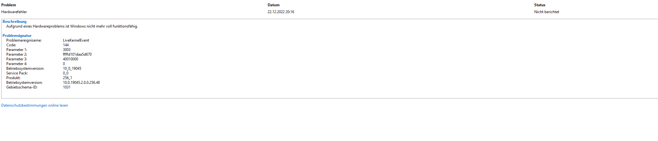 Ich habe seit den ich denn pc nur Probleme mit der scheiße Kiste erst war immer ein Probleme das er ein BlueScreen hatte mit den Fehler WHEA_UNCORRECTABLE_ERROR (124) habe der immer beim zockt habe das Probleme habe ich wohle jetzt gefunden wenn ich den Ram auf profil 1 stelle ist der Fehler auf getreten und ohne kann ich länger zocken also habe ich gedacht der Ram hatte ein schaden aber ist nicht so habe Memtest86 durch laufen lassen nix keine Fehler dachte dann ok lass und lass so laufen jetzt kommt so das ich immer nach 2 t oder nach par stunden oder so der pc ruckelt anfängt und dann ein Friert und nur noch die mause geht und ich muss dann den pc neu starten Danach geht er wieder wie lange keine Antwort vielleicht 2t oder so das ein Frieren habe ich gelesen das dass von den Temp sein kann das kann ich mir nicht denken da die Cpu so 34° bis 65° hat und das in meine Augen ok sein müsste die Temp der Mainboard die sind schon krass aber die sind laut Aussagen des Internet nicht glaub hafte aber egal Bild von HwMonitor poste ich hier mal mit und noch die