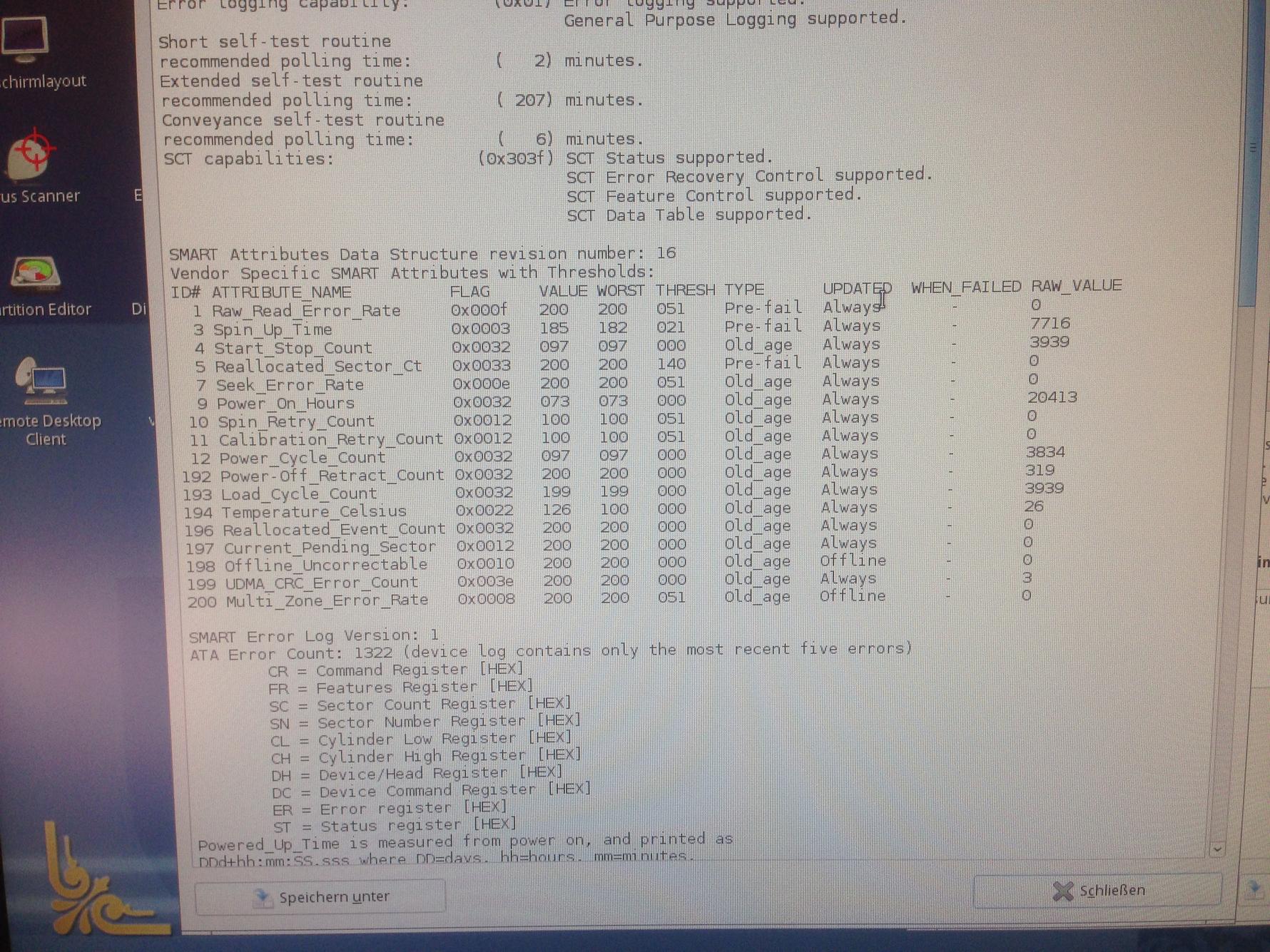 140 ist nicht der Rohwert, sondern "Thresh". Der Rohwert für diese Attribut ist 0, alles ist hier alles i.O. Die Platte ist mit über 20.000 Betriebsstunden nicht mehr die jüngste, bis auf die Ultra-DMA Fehler scheint die aber lt. SMART OK zu sein. Das die Minidumps nicht erstellt werden können deutet allerdings schon auf ein Problem mit der Platte hin...