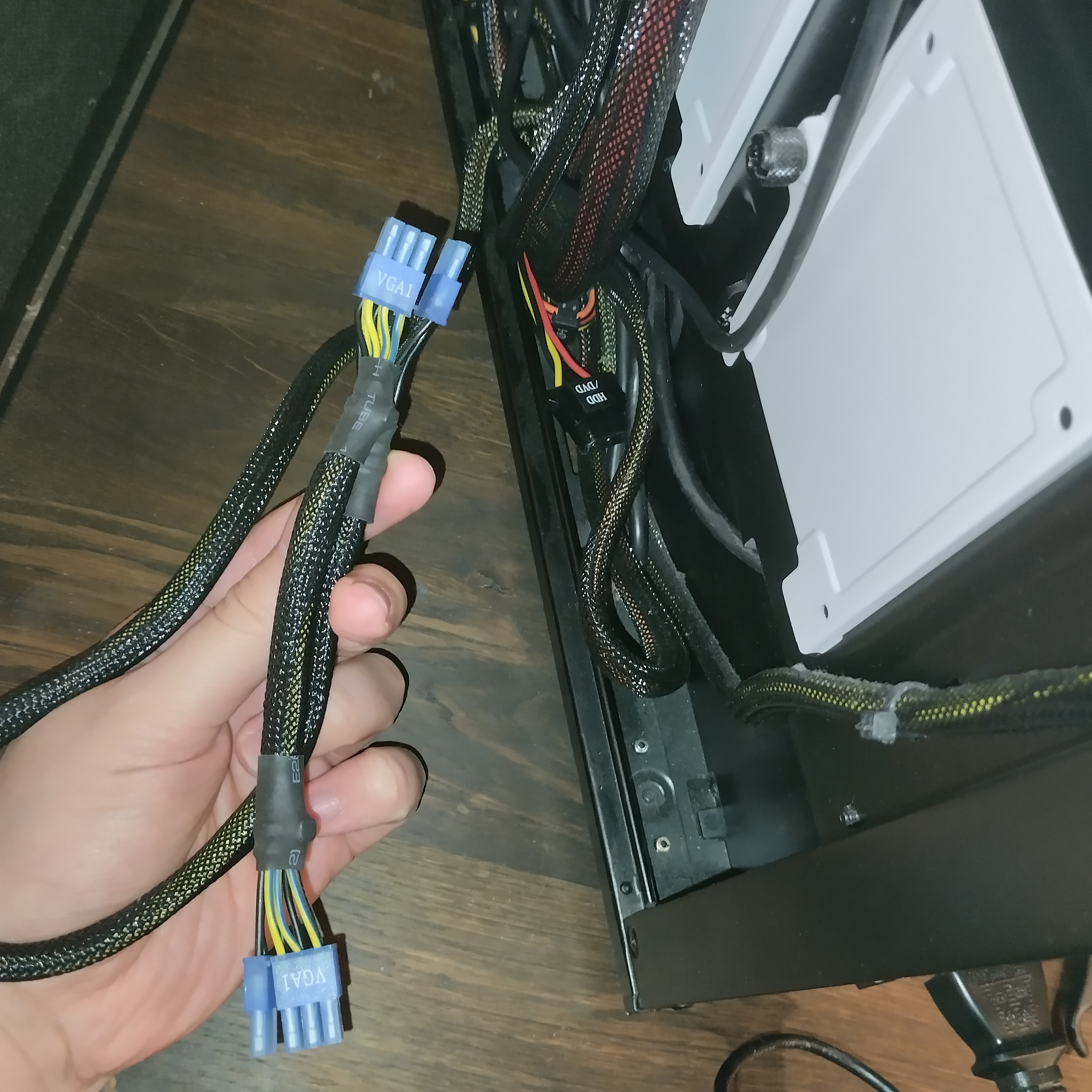 Du sollst die Garfikkarte mit zwei separaten Kabel am Netzteil anschlieĂen,