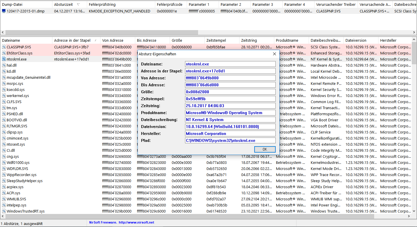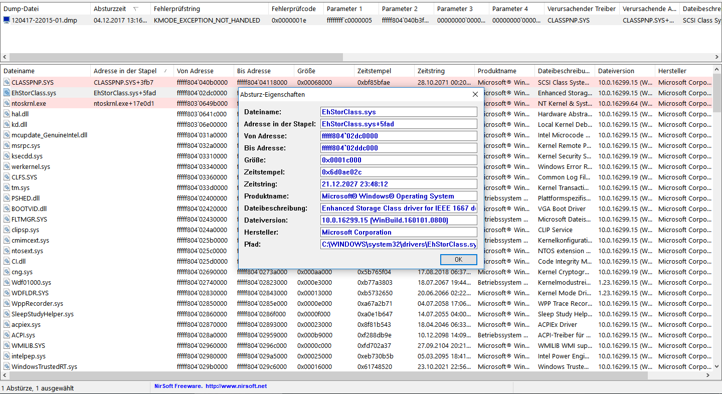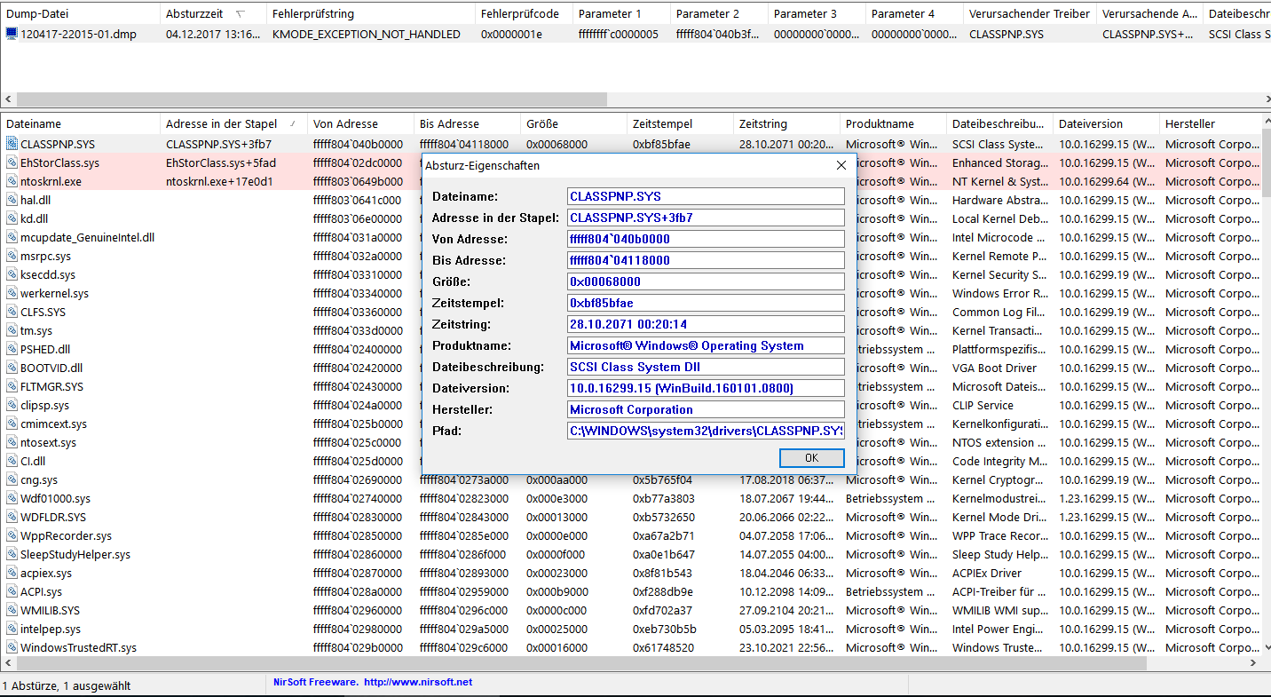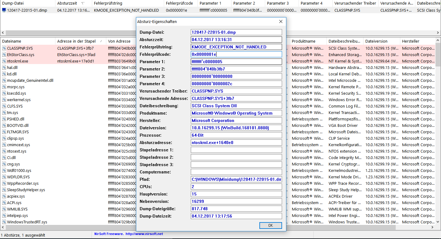 Die gleiche Ursache, also den CLASSPNP.SYS Treiber zeigt mir BlueScreenView wenn ich die Dump-Datei anzeigen lasse.