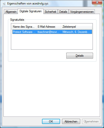 ich bekomme seit kurzem einen Bluescreen mit der Datei "acedrvlg.sys" und finde aber keine Treiber mit dieser Datei oder sonstige Zuordnung um den Schuldigen ausfindig zu machen.