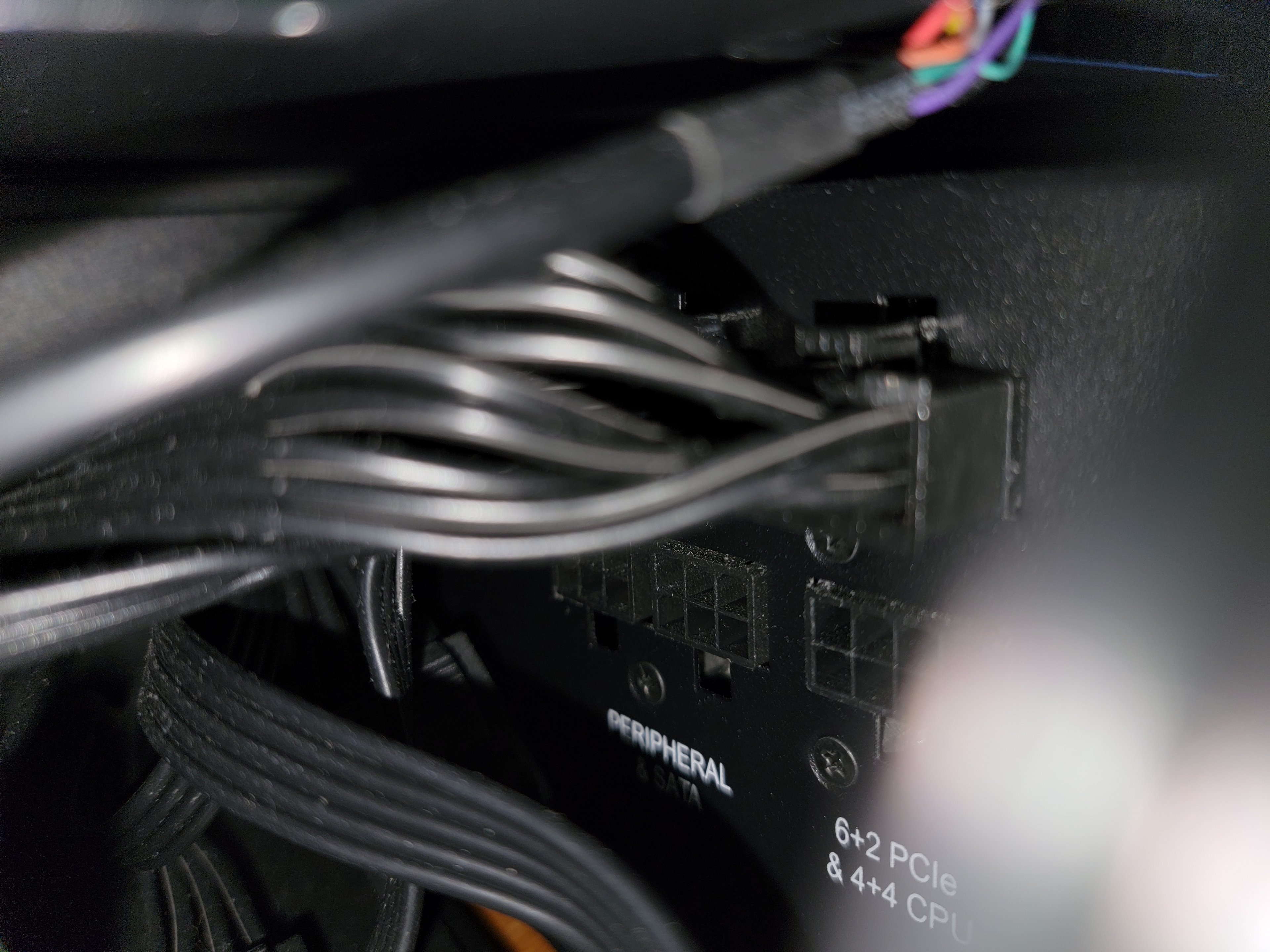 Nicht vergessen oder übersehen, vor allem da du ja wahrscheinlich eines dieser tollen PSUs mit "Cable Management" hast. Da hat schon mancher einen Fehler eingebaut, weil der Stecker am Netzteil nicht richtig steckte, oder am falschen Ausgang, die 12 V-Rails 'asymmetrisch' belastet waren, oder die Kabel eines anderen Netzteils verwendet wurden welche aber inkompatibel waren.
