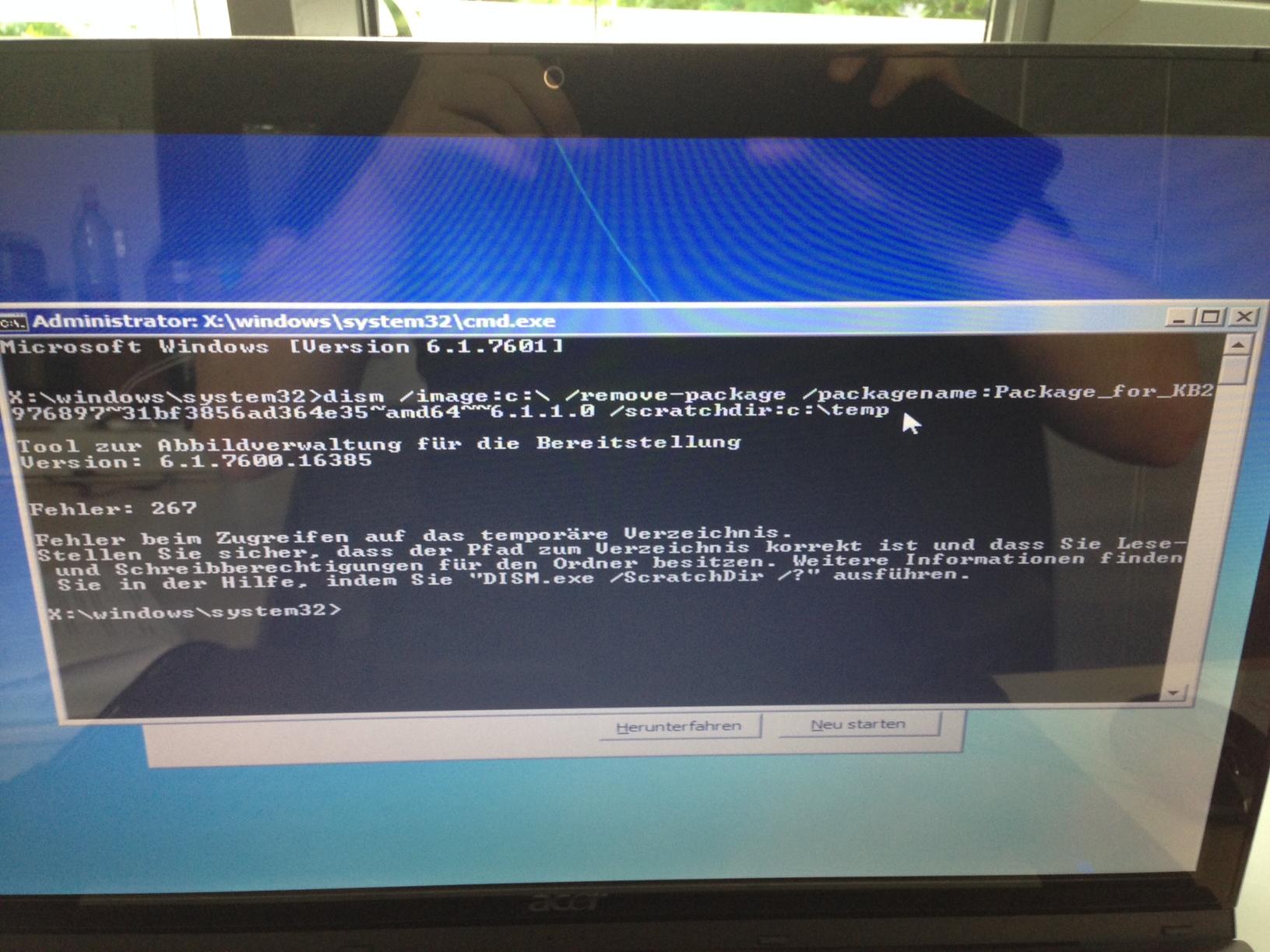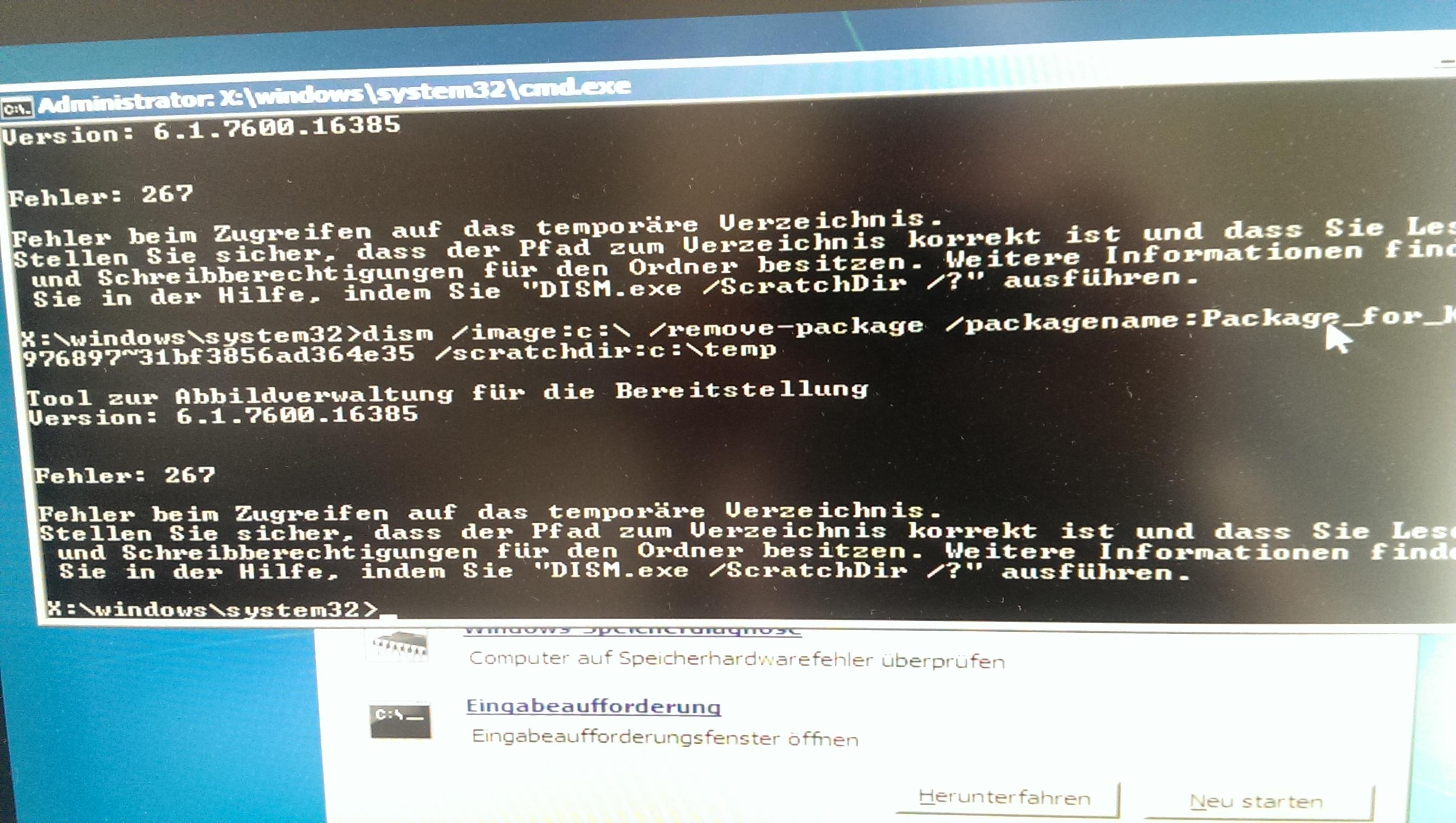 ich komme nicht mehr in Windows und habe deswegen über die Eingabeaufforderung die oben beschriebenen befehle eingegeben . Auf allen Laufwerken, immer mit Fehler 267.