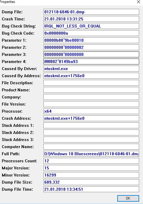 Bis zum "fall creators update" im Oktober lief der Rechner ohne Probleme. Direkt danach kam es zu Bluescreens (Screenshot von Bluscreenview im Anhang). Nachdem ich den Pc auf eine Version vor dem Update zurückgesetzt habe gab es wieder keine Probleme. Im Dezember musste ich das Update dann aber machen und es kamen direkt wieder Bluescreens. Die Bluescreens treten teilweise bereits nach wenigen Minuten auf, teilweise erst nach einigen Stunden. Im abgesicherten Modus kommt es nicht zu Bluescreens.