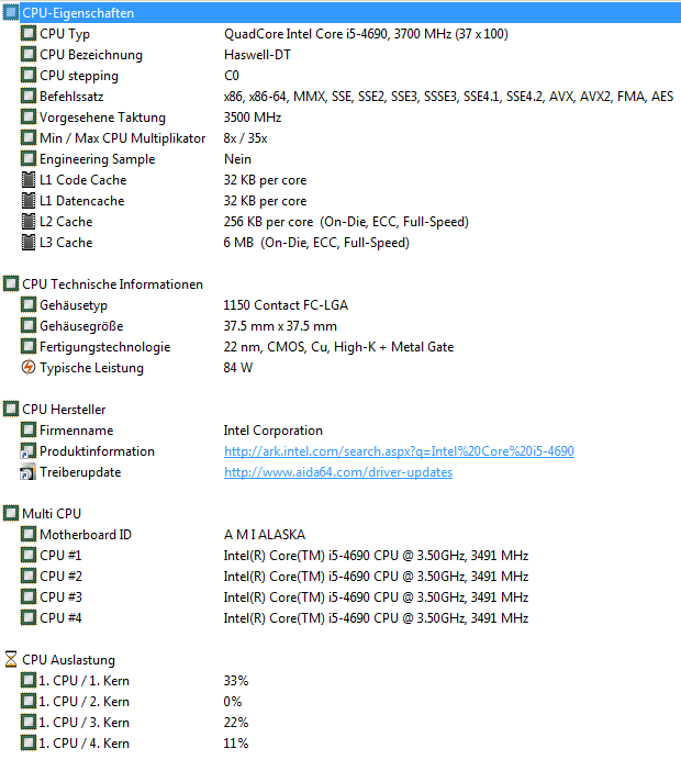 CPU Typ QuadCore Intel Core i5-4690, 3700 MHz (37 x 100)