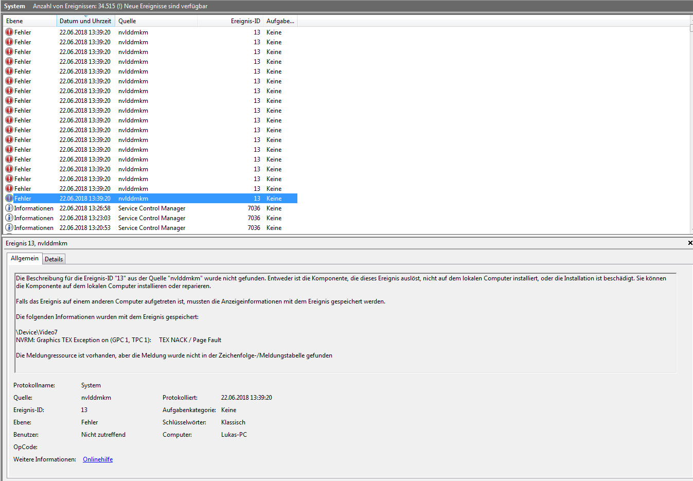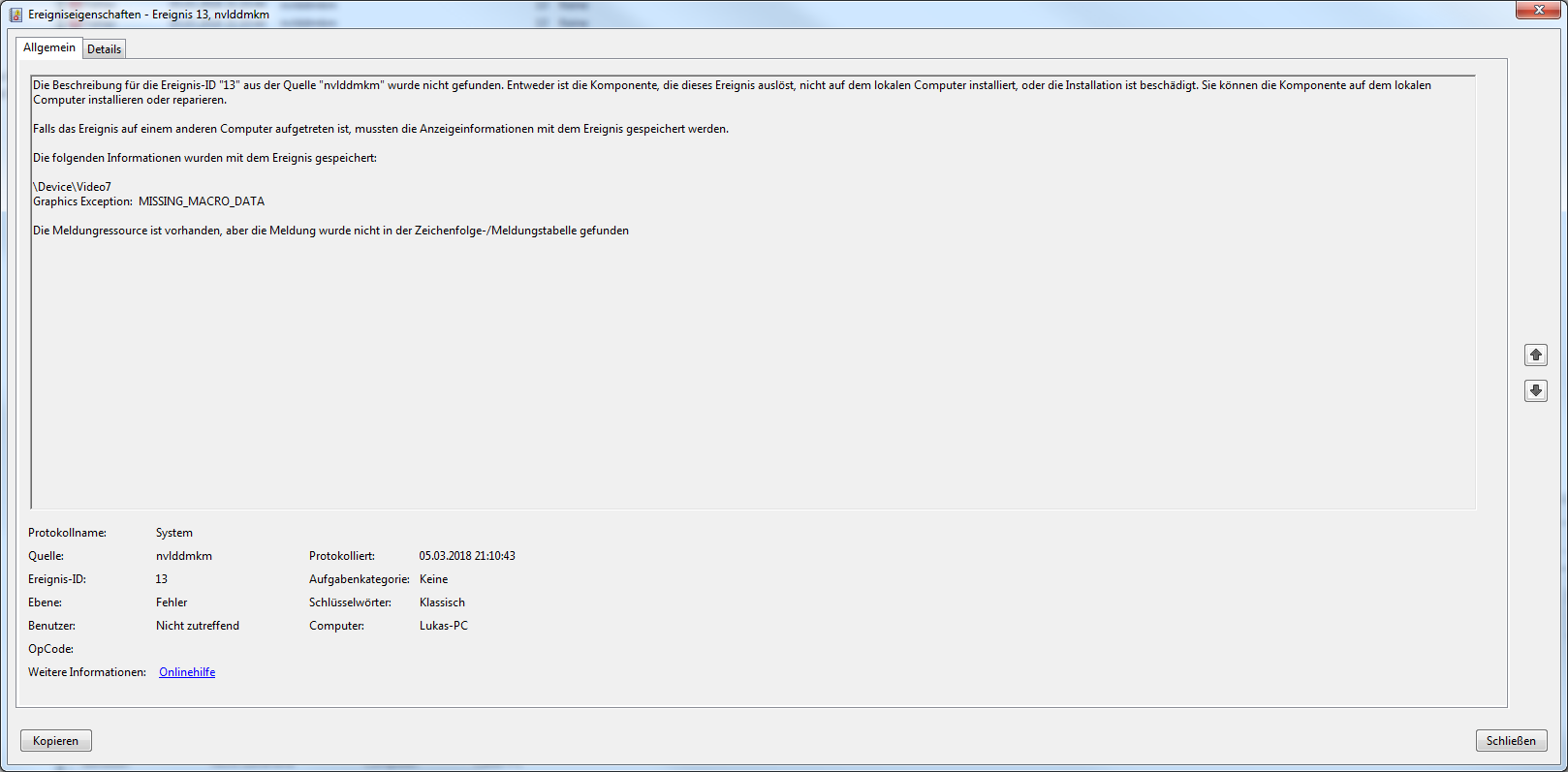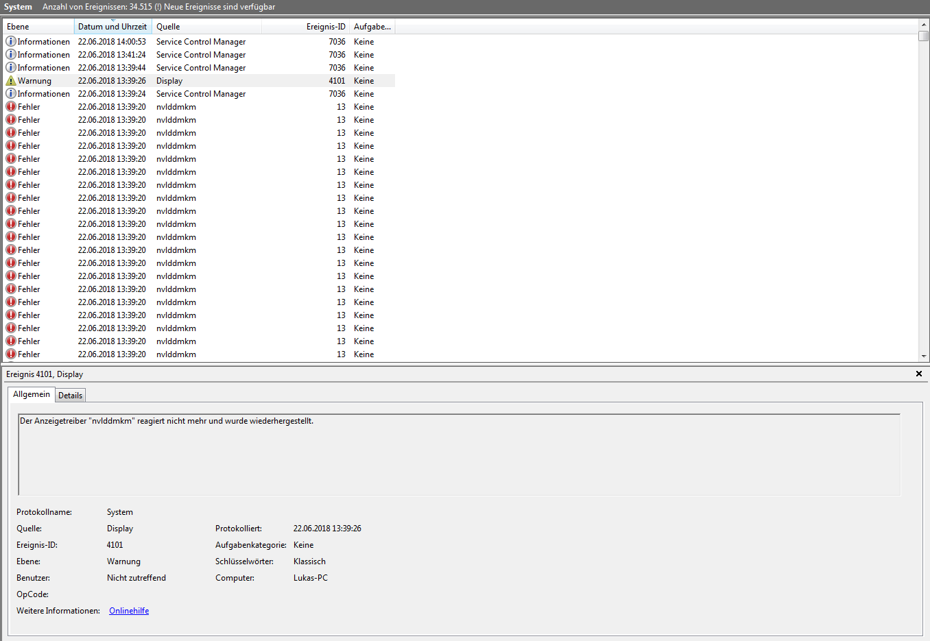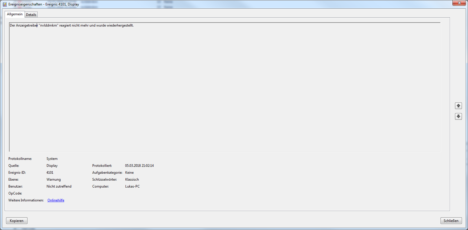 seit einigen Wochen beschäftigt mich die Fehlermeldung: "Der Anzeigetreiber wurde nach einem Fehler wiederhergestellt".