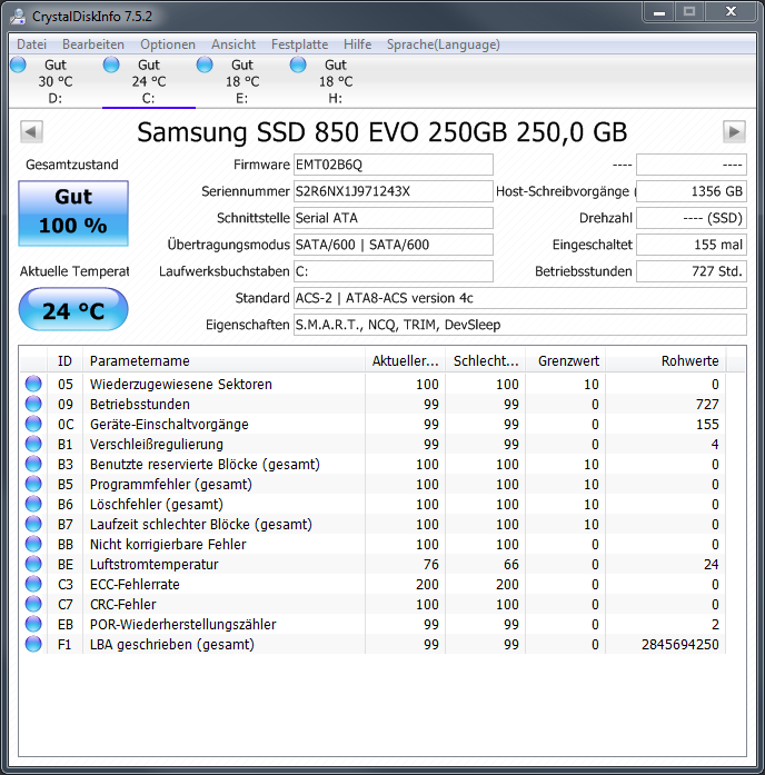 In allen vier Fällen ist die Datei "ntoskrnl.exe" verantwortlich, in zwei Fällen davon zudem die Dateien "ntfs.sys" und "dxgmms1.sys". Sowohl Festplatte, als auch RAM habe ich einem Test unterzogen. Den RAM habe ich mit MEMTest+ getestet und 3 mal durchlaufen lassen. Die Festplatte wie folgt:
